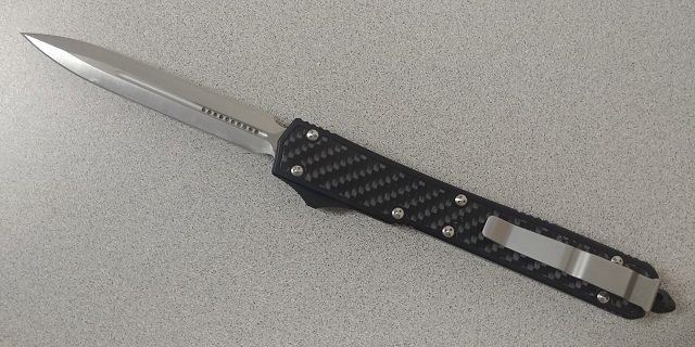 Special 10" Black Carbon D/A OTF Automatic Knife Satin Dagger. 10 inch total length 4.25" 440 stainless steel blade. It comes with a glass breaker on the end of the handle, a belt sheath and a pocket clip. Very strong spring action in and out with the push of the button.