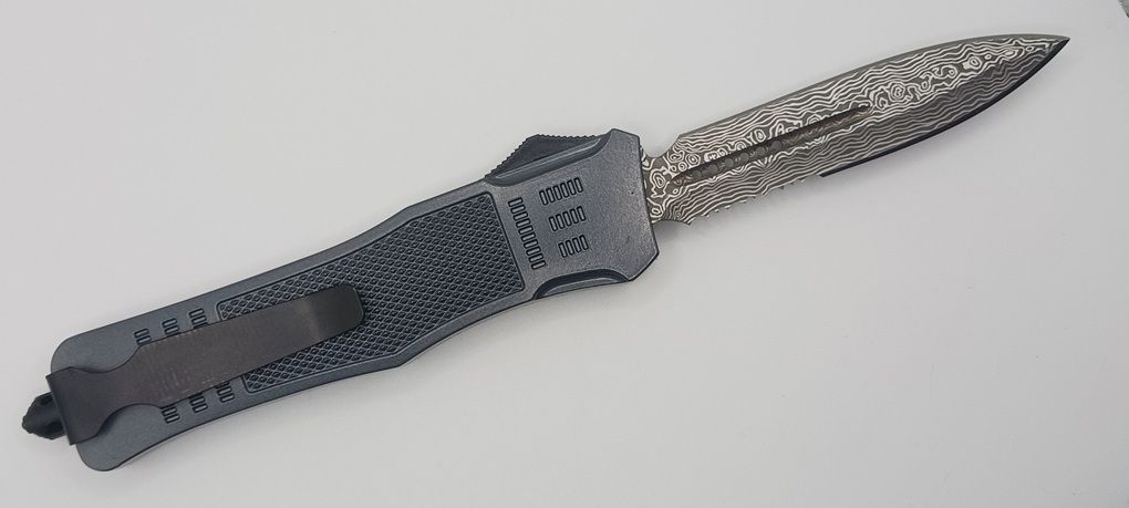 Swimsuit Pin Up Girl D/A OTF Automatic Knife Damascus Dagger Serrated. Overall Length: 24cm - 9.4" Blade Length: 9,8cm - 3.8" Blade thickness: 2.5mm - 0.11" Weight: 285gr - 10oz Blade Material: Damascus steel Handle Material: Aluminum Coated Inlay Material: Aluminum Made in: China