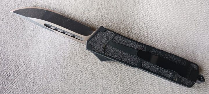 Titan Black Grip D/A OTF Automatic Knife Drop Point. Blade Material 440 Stainless Steel Blade Type Razor Folding Action Out the Front Handle Construction Stainless Steel Features Belt Clip, Glass Breaker, and Nylon Carrying Case Blade Length 3.5" Handle Length 4.75" Overall Length 8.25"