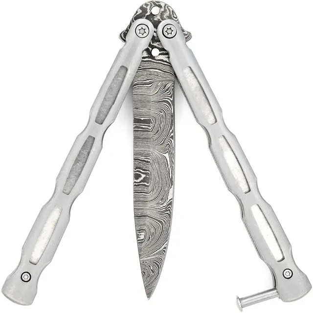 Unchained Damascus Steel Drop Point Heavy Duty Butterfly Knife. Bring eye-catching style and premium craftsmanship to your stock with the Unchained Drop Point Balisong Knife. Designed with a stainless steel drop point blade and a handle forged from Damascus steel, this butterfly knife delivers both performance and appeal. Built tough with heavy-duty materials and a safety latch, it's a reliable piece that will catch the attention of collectors, knife enthusiasts, and balisong trainers. A top-tier product for knife shops and online resellers looking to add value and variety to their offerings. Specifications: Overall Length: 8.875 Inches Blade Length: 4 Inches Blade Material: Stainless Steel (Silver Finish) Blade Style: Drop Point Blade Thickness: 3mm Handle Length: 4.75 Inches Handle Material: Damascus Steel Weight: 1.12 lbs Includes: Safety Latch Features: Stainless Steel Blade – Drop Point Shape for Versatility Damascus Handle – Stylish & Sturdy Heavy Duty for Daily Use Safety Latch for Secure Flipping Ideal for Bulk Orders – Great Resale Potential