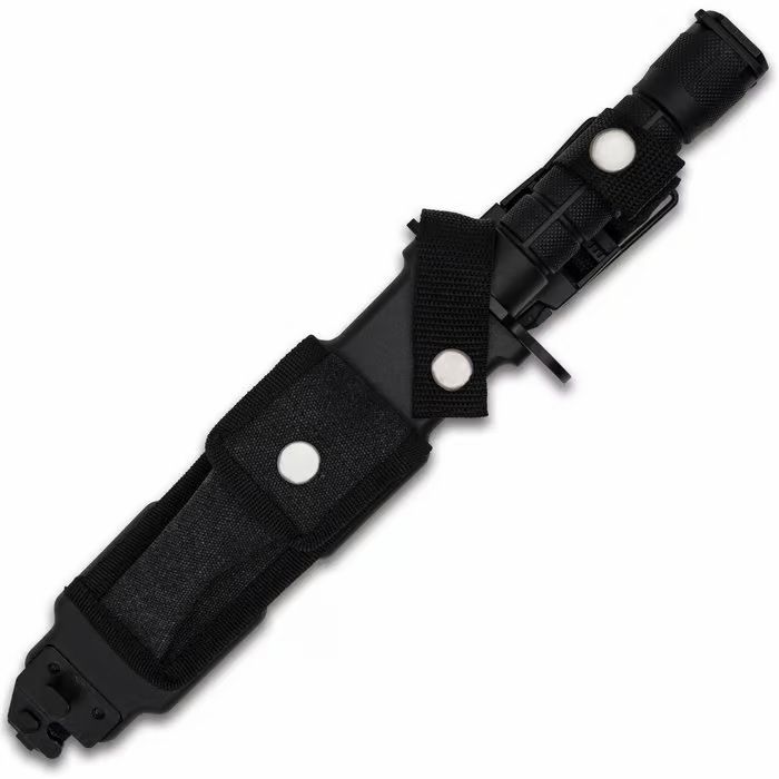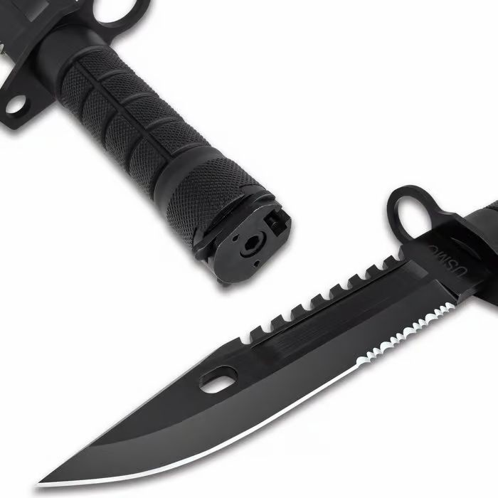 USMC M-9 Bayonet Knife 7" Blade 12" Overall. The officially licensed USMC M-9 Bayonet Knife is a tribute to practical design and Marine heritage. Its 7" stainless steel blade features a sawback spine and a black, non-reflective coating that minimizes glare. The muzzle-ring guard and bayonet clip are designed to fit standard rifle lugs, giving this knife its classic bayonet functionality. The blade is laser-etched with “USMC,” reinforcing its proud connection to the Corps. The 12" overall design includes a deep-grooved TPU handle, built for a sure grip in a variety of conditions. The included nylon belt sheath adds serious utility with multiple carry options, a removable ammo pouch, integrated sharpening stone, and a functional barbwire cutter. From gear wall to outdoor use, this knife honors USMC tradition while offering practical performance. OFFICIALLY LICENSED: Features authentic USMC laser-etching and construction approved by the United States Marine Corps. FUNCTIONAL SAWBACK BLADE: 7" stainless steel blade with spine notching for additional cutting power. SECURE GRIP HANDLE: Textured TPU handle with deep grooves provides a slip-resistant hold. BAYONET ATTACHMENT: Includes bayonet clip and muzzle ring to fit standard rifle bayonet lugs. UTILITY-READY SHEATH: Nylon sheath includes a sharpening stone, barbwire cutter, and detachable ammo pouch.