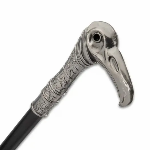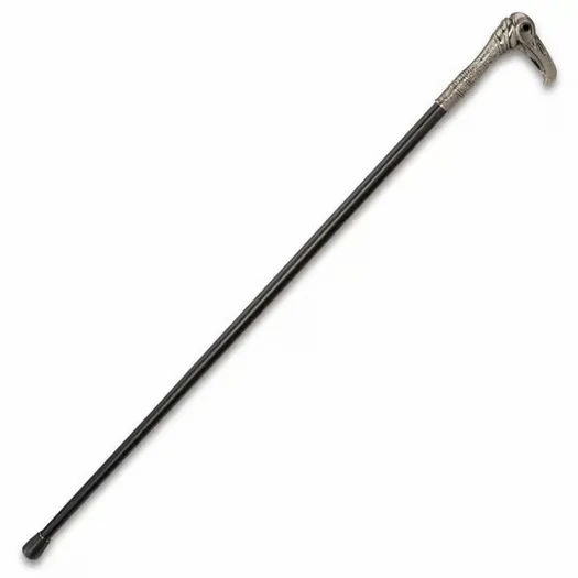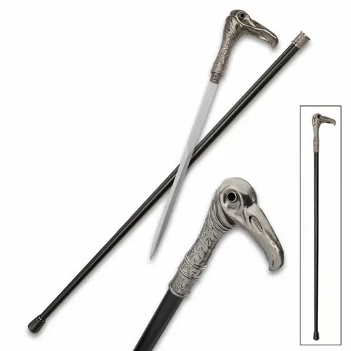 Vulture Head Assassin Sword Cane. With its dark, Gothic appeal our Vulture Head Assassin Sword Cane is sure to make a statement when you add it to your ensemble. The metal alloy handle is crafted in the shape of a vulture with piercing glass eyes and a menacing curved beak. Intricate scrollwork is crafted into the handle leading down to the cane’s shaft. The 12 1/4” hidden blade is made of stainless steel and is accessed by unscrewing the handle from the shaft. The black aluminum shaft features a rubber foot for a slip-free grip when using it. Assassin sword cane with Gothic appeal Hidden 12 1/4” stainless steel blade Crafted metal handle with glass eyes Aluminum shaft with rubber toe Overall length: 36 1/4”