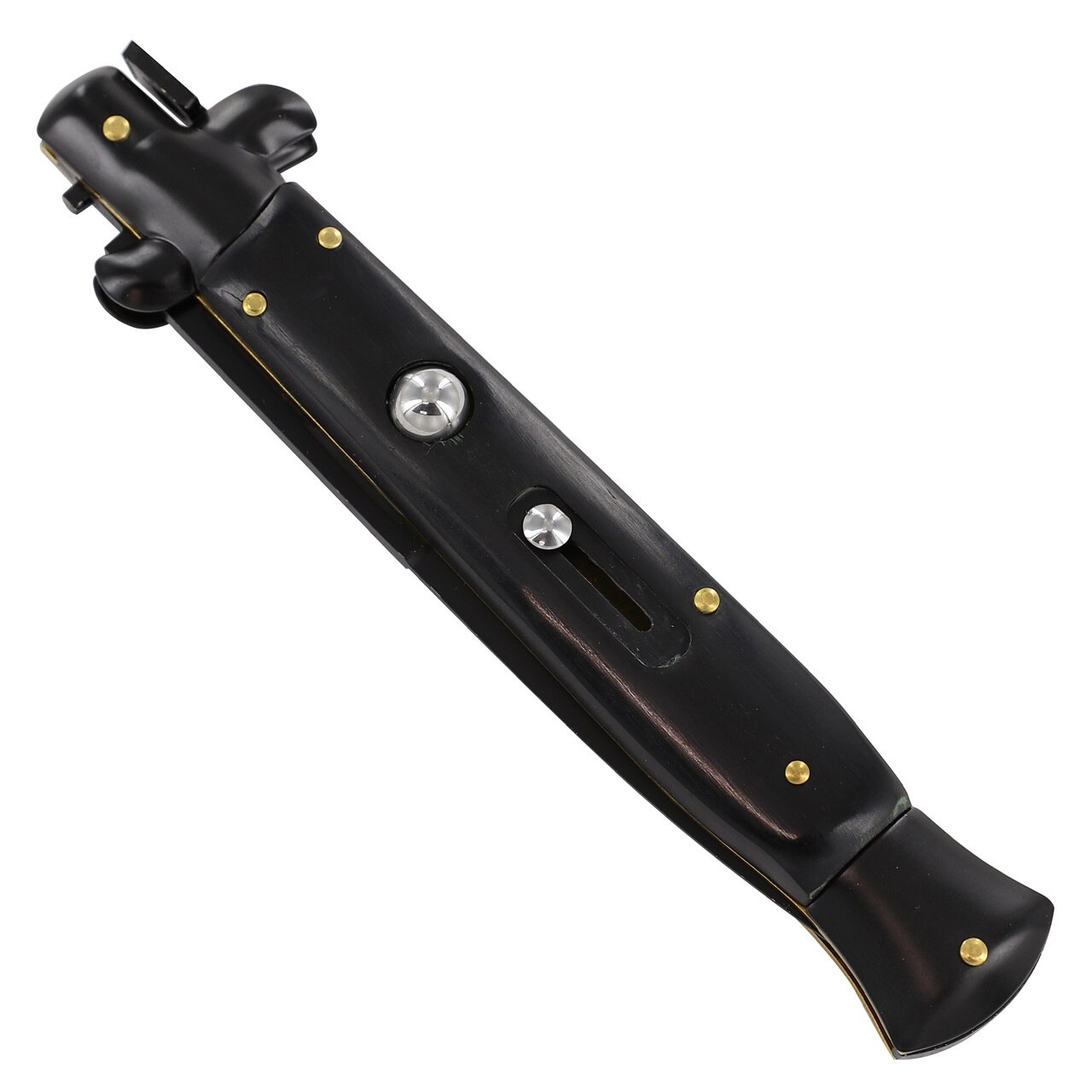 10.5" Black Wood Stiletto Automatic Knife Black Bayo. This push button automatic stiletto has a sharp bayonet style blade forged of stainless steel, so rusting will never be an issue. The handle has a brass frame with brass pins, with a silver opening button and a safety lock feature for added protection. Included is a free sturdy black nylon carrying case that has a loop so you can attach it to your belt. Overall Length: 10 1/2 inches