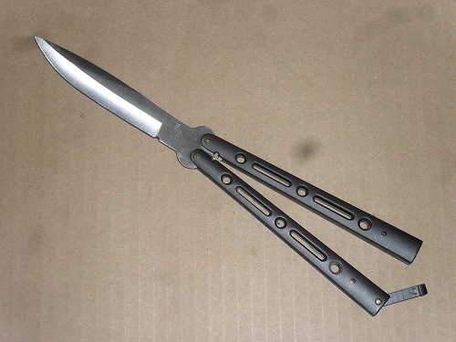 10" Black Heavy Duty Butterfly Knife. 4.5 inch blade all metal construction with brass pins. 440 stainless steel with weight of 5.4 ounces
