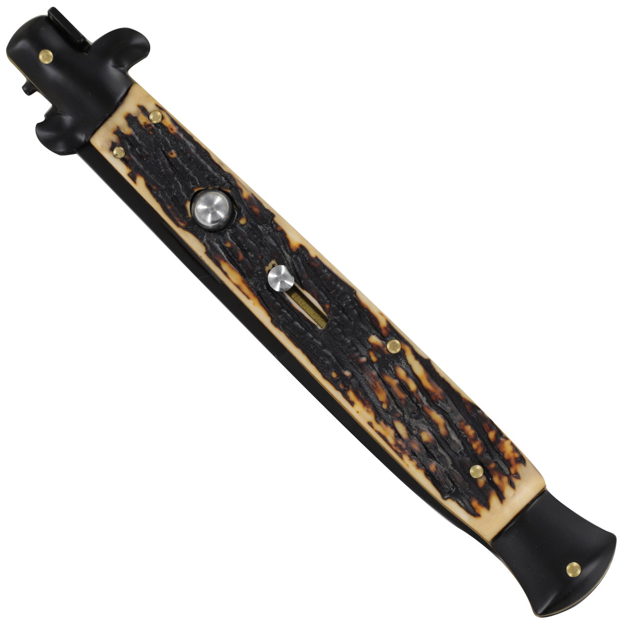 12.5" Faux Stag Stiletto Automatic Knife Black Bayo Switchblade. 6-inch stainless-steel blade with a anodized black finish, as well as an impressive faux stag handle. To open the knife, you will press the shiny silver button at the top of the handle. To close, push the black t-shaped bolster above the handle toward the base with your thumb. A slide lock on the handle prevents accidental opening while not in use. Included with this knife is a free black nylon quick release sheath with belt loop for easy carry. Overall Length: 12.50 Inches, Blade Length: 5.62 Inches