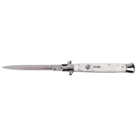 13" Godfather White Pearl Stiletto Automatic Knife Switchblade Dagger Blade. This gigantic switchblade sits at 13" overall length. A push of the button flings the 6" blade open. Each knife comes with a nylon sheath and has a safety switch on the handle to prevent accidentally opening. Blade: 6" Overall: 13" Closed: 7"
