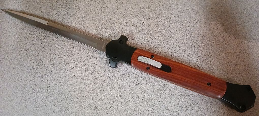 13" Mago Brown Wood Stiletto D/A OTF Automatic Knife Bayonet Point Satin Plain. This double action stiletto comes with a belt sheath. 5.7 inch blade and 7 inch handle with a weight of 11.2 ounces. The knife is very large and has great spring action with the push of the button. Its impressive and something you want to add to your collection.
