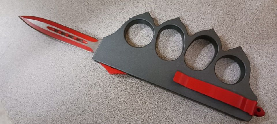 1918 US Gray D/A OTF Trench Automatic Knuckle Knife Red Two Tone Dagger. Overall Length: 9 Inches Blade Length: 3.5 Inches Blade Material: 440 Stainless Steel, Powder coated red finish Blade Style: Dagger Handle Length: 6 Inches Handle Material: Cast metal, Heavy duty construction Includes: Pocket Clip, Glass breaker, belt sheath.