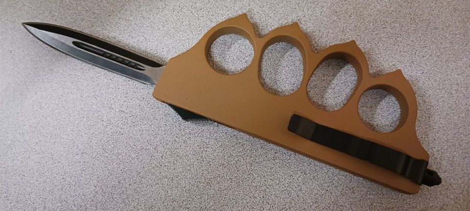 1918 US Tan D/A OTF Trench Automatic Knuckle Knife Black Two Tone Dagger. Overall Length: 9 Inches Blade Length: 3.5 Inches Blade Material: 440 Stainless Steel, Powder coated black finish Blade Style: Dagger Handle Length: 6 Inches Handle Material: Cast metal, Heavy duty construction Includes: Pocket Clip, Glass breaker, belt sheath.