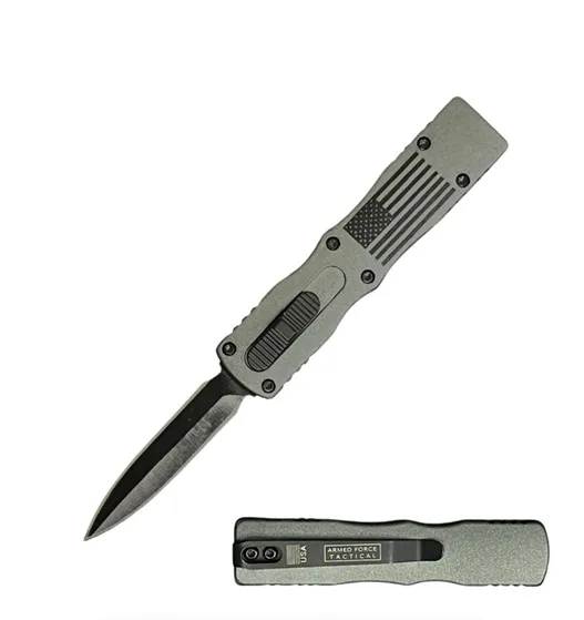 5.25" Rugged American Flag Army Grey Handle Mini OTF Automatic Knife. 3D printed American Flag Army Grey handle is constructed from zinc alloy. A slider is provided for deployment and retraction of this dual action blade. The movement is smooth and flawless. The stainless steel blade comes black finish. Specifications Overall Length: 5 1/4 Inches Handle Length: 3 1/4 Inches Blade Length: 1 7/8 Inches Features Spear Point Blade 440 Stainless Steel Blade Smooth Assist To Open And Close Mini OTF Style Full Aluminum Handle with 3D printed American Flag Army Grey Easy To Carry Pocket Clip