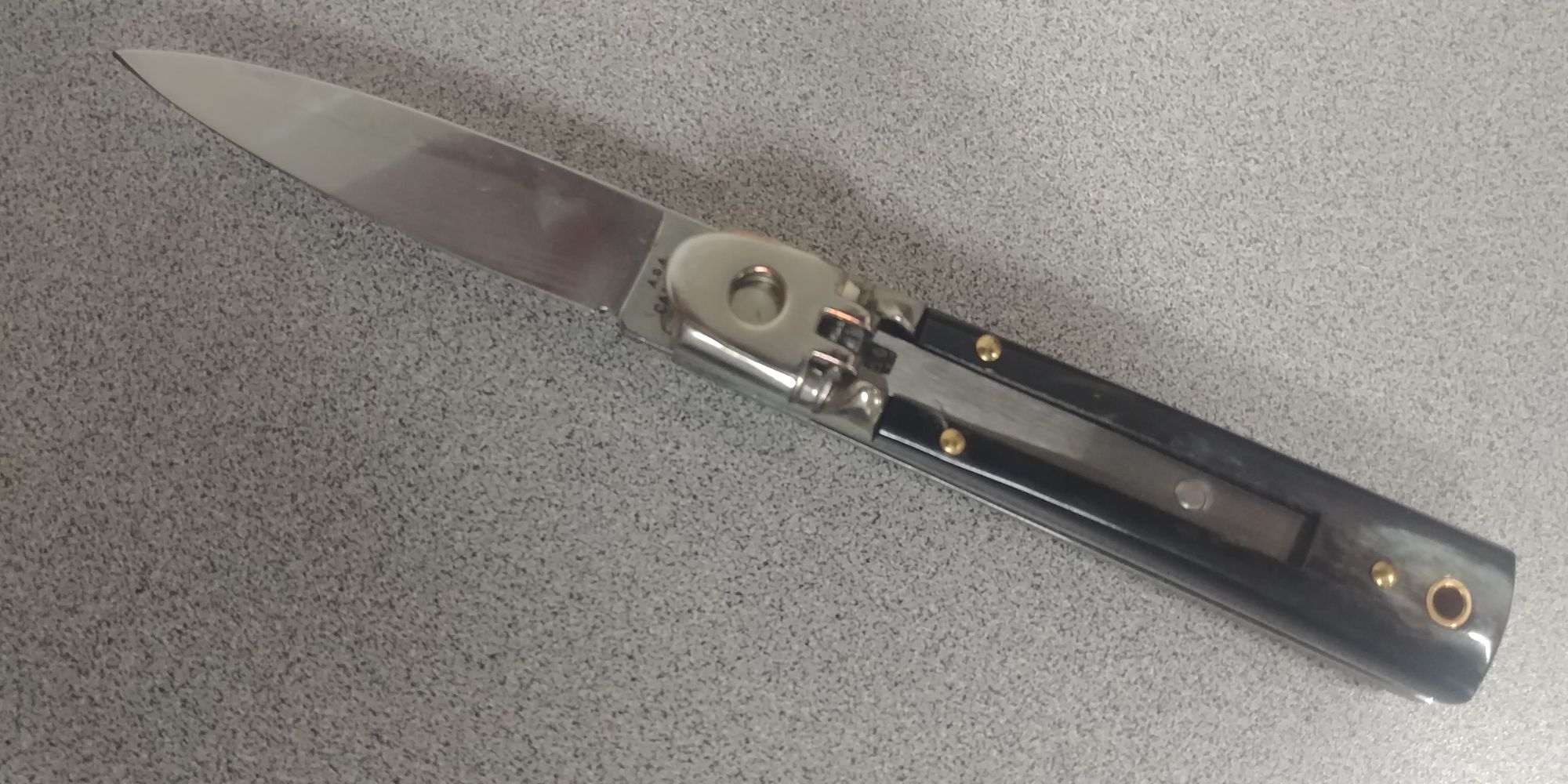 6" A.G.A Campolin Brazilian Horn Leverlock Automatic Knife. This is the classic slim version. The small size makes it fit in your pocket perfectly. Stainless steel bolsters - Overall Length: 15cm - 6" Blade Length: 6,5cm - 2,5" Blade thickness: 2,7mm - 0.11" Weight: 75 gr Blade Material: Stainless steel Handle Frame Material: Brass Made in: Italy