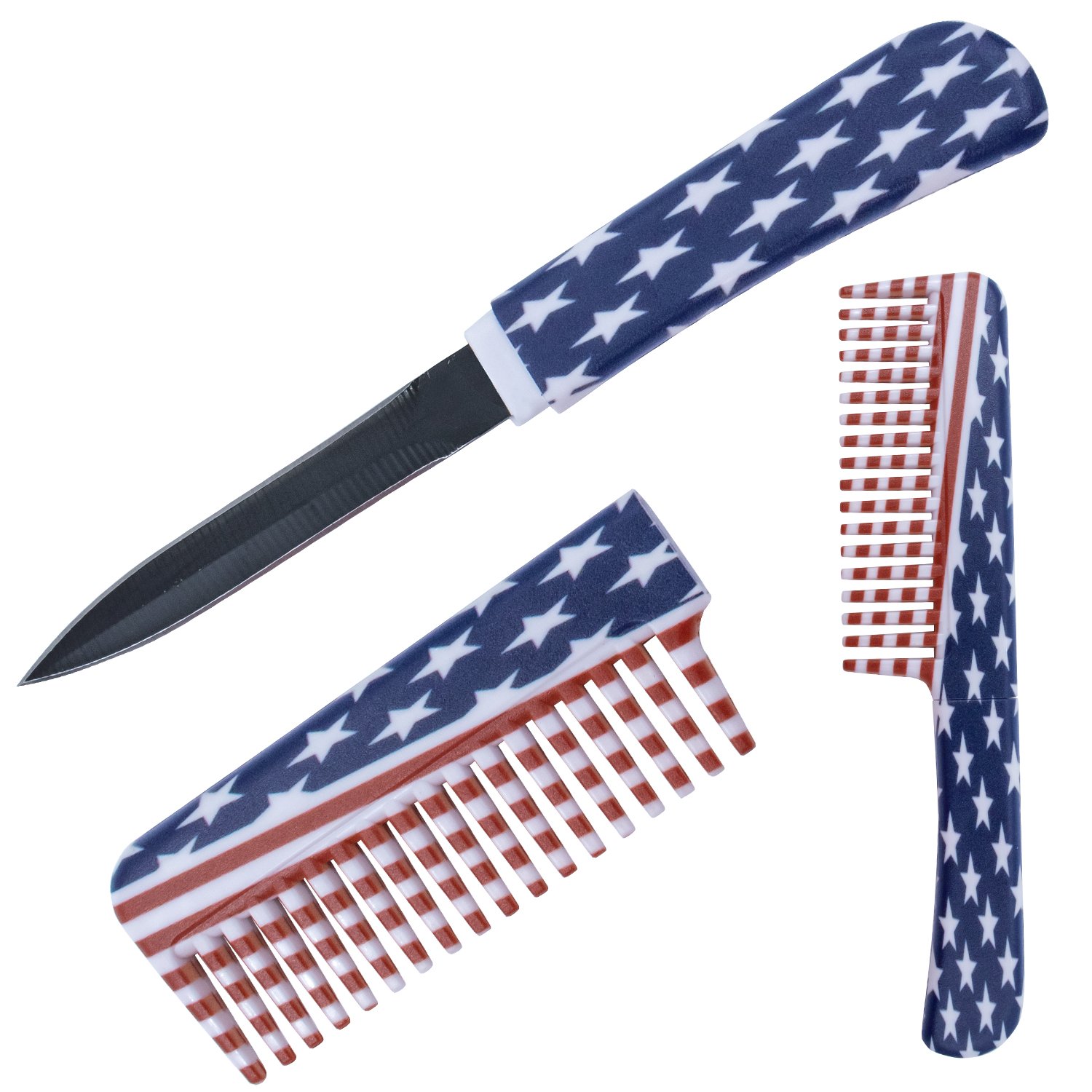 6" Comb Knife USA Flag Enlarged. The knife is concealed inside the comb and has a black dagger blade. 3.10 inch blade. 3.15 inch handle. 6.25 inch overall length.