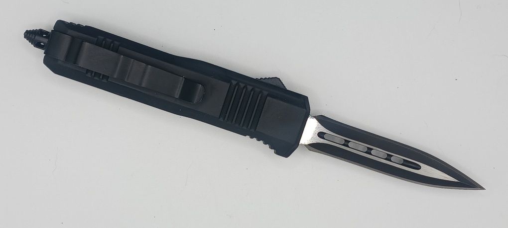 6.5" Ranger Black D/A OTF Automatic Knife Dagger Point Two Tone Plain. 6.5 inches total length 2.5" 440 stainless steel blade. comes with pocket clip, glass breaker and a belt sheath. This is old stock we found laying around. Very limited stock.