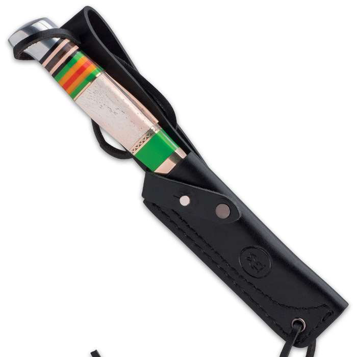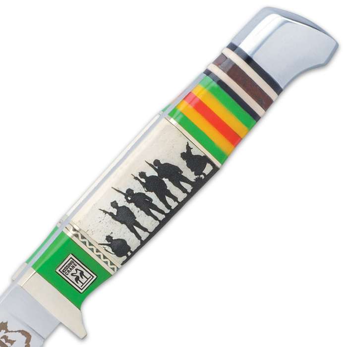 7.75" Kissing Crane Vietnam Boot Knife. Now introducing, a fixed blade tribute knife to act as a companion to the commemorative Vietnam Veteran pocket knives The full-tang, 3 1/2” stainless steel blade has Vietnam Veteran themed etchings and extends from a brass mini handguard The handle has a white bone panel with a 3-D printed soldier silhouette, accented with the colors of the Vietnam service ribbon The 7 3/4” overall fixed blade knife slides like a glove into a premium black leather belt sheath for comfortable carry