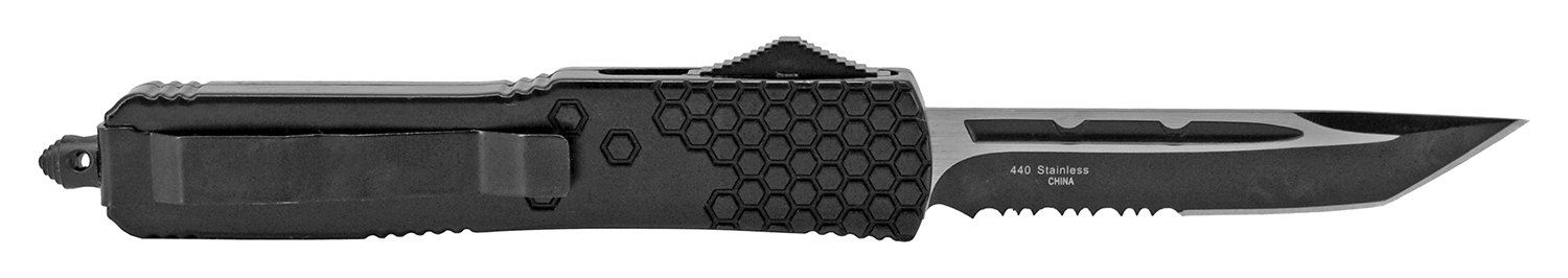 8.5" Techno Black D/A OTF Automatic Knife Black Tanto Serrated. Blade Material 440 Stainless Steel Blade Type Serrated Folding Action Out-the-Front Handle Construction Stainless Steel Features Belt Clip, Nylon Carrying Case, and Glass Breaker Blade Length 3.38" Handle Length 5.13" Overall Length 8.5"