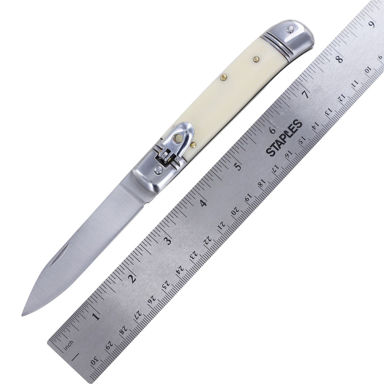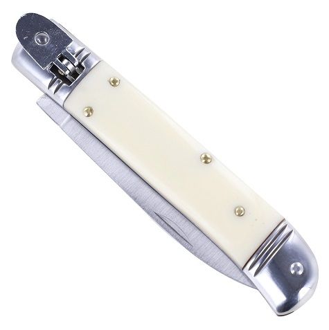 8" Classic White ABS Leverlock Automatic Knife Flat Grind Drop Point. Specifications Overall Length: 8 Inches Blade Length: 3.53 Inches Blade Width: 0.75 Inch Blade Thickness: 2.40 mm Handle Length: 4.52 Inches Blade Style: Spey Point Blade Construction: Stainless Steel Handle Construction: ABS Includes: Black Nylon Sheath Features: Lever Lock, White ABS Grips, Automatic Knife