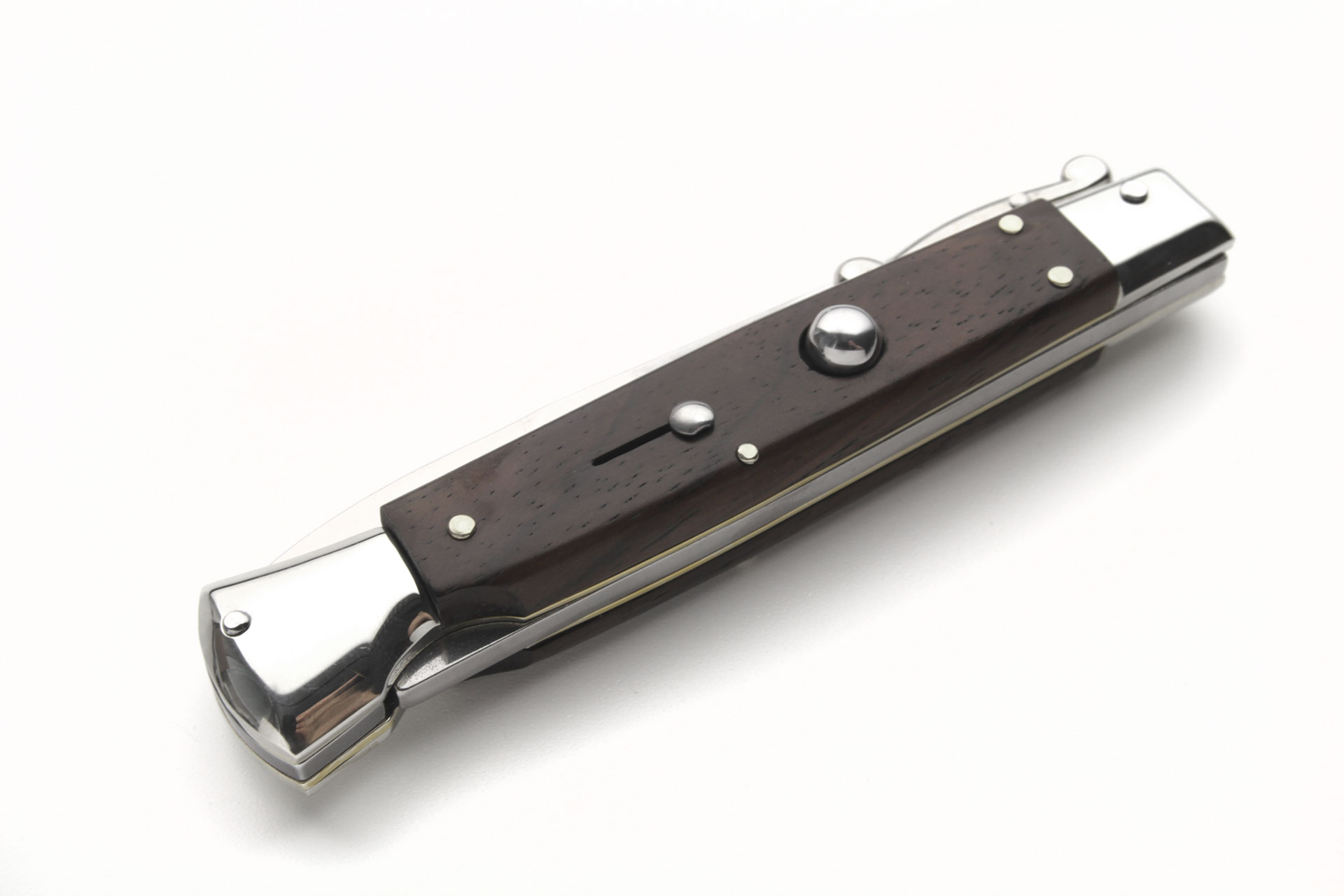 9" AGA Campolin Italian Stiletto Swinguard Automatic Knife Cocobolo Wood Bayo. The A.G.A Campolin 9" automatic swing guard stiletto. Made of durable 440A stainless steel, it features a safety slide to keep the blade from accidentally opening, a push button opener with rapid action, and a classic finger guard made of nickel silver that swings into place as the blade opens.This one has a bayonet blade and santos wood also boasts over brass liners. It has a lock back release on the spine and the A.G.A Campolin logo etched on the tang. Note: as it is a natural material, color, texture and pattern will vary from knife to knife. Overall lenght: 23cm – 9" Blade Lenght: 10,50 cm – 4,125" Blade Thickness: 3,5mm – 0,34" Weight: 108 grBlade Material: AISI 440A stainless steel Handle Material: Santos wood Frame material: Brass Made in: Italy
