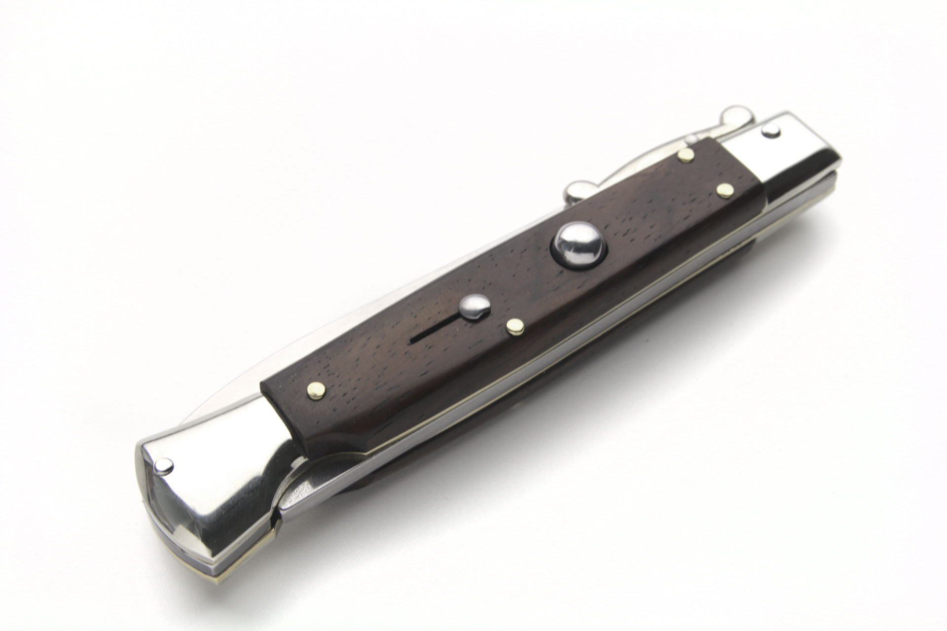 The A.G.A Campolin 9" automatic swinguard stiletto. Made of 440A durable stainless steel, it features a safety slide to keep the blade from accidentally opening, a push button opener with rapid action, and a classic finger guard made of nickel silver that swings into place as the blade opens. This one has a dagger blade and Santos wood scales also boasts over brass liners. It has a lock back release on the spine and the A.G.A Campolin logo etched on the tang. Note: as it is a natural material, color, texture and pattern will vary from knife to knife. Overall lenght: 23cm – 9" Blade Lenght: 10,50 cm – 4,125" Blade Thickness: 3,5mm – 0,34" Weight: 108 gr Blade Material: AISI 440A stainless steel Handle Material: Santos woodF rame material: Brass Made in: Italy
