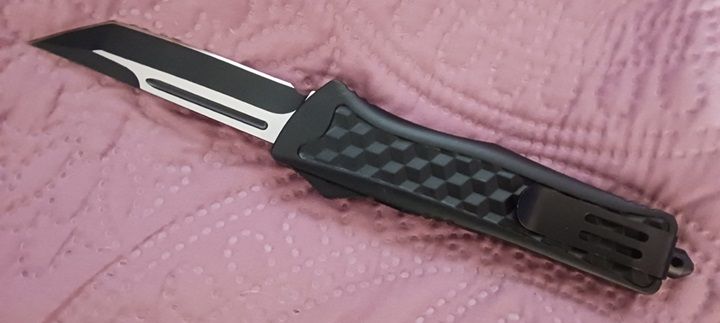 9" American Mercenary Tactical D/A OTF Automatic Knife Two Tone Tanto. This American Mercenary OTF knife features a two tone black and satin finish stainless steel tanto style blade. The dual action allows you to use a slider trigger located on the side of the handle to propel the blade forward as well as retract. A steel pocket clip and handy emergency glass breaker are featured on the handle. Overall Length 9 inches with Handle Length of 5.5 inches. Includes FREE Nylon Pouch with Belt Loop.