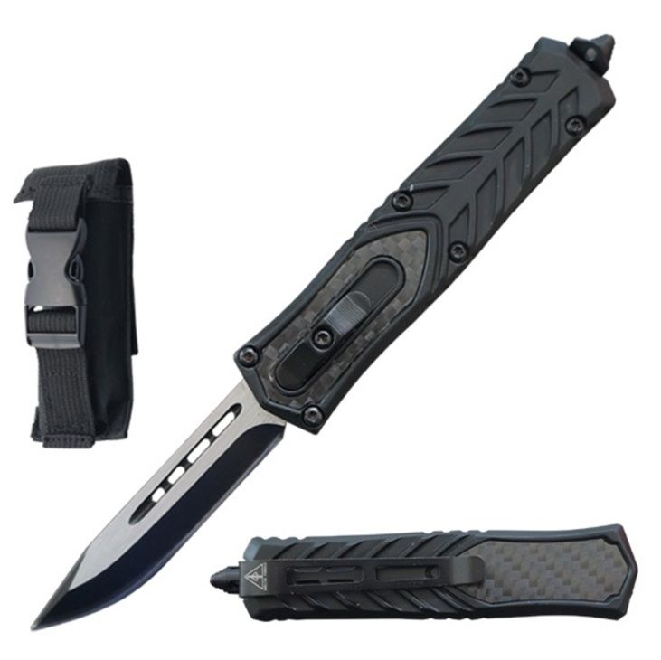 9" Everyday Carry Carbon Fiber Out Of The Front D/A OTF Knife. Everyday Carry Carbon Carbon Fiber fully automatic double action OTF knife. Comes with sturdy zinc alloy handle. This knife will be the perfect addition to your collection with its smooth operation and easy to carry design. A steel pocket clip and handy emergency glass breaker are featured on the handle. Overall Length 9 inches with Handle Length of 5.5 inches. The tactical sheath is made from nylon with a plastic clip an easy detachable Velcro belt loop. Specifications: Overall Length: 9" Closed Length: 5.5" Features: Handle Material: Zinc Alloy with Rubberized Coating Carbon Fiber Blade Material: 440C Stainless steel Two tone black and satin finish drop point blade Pocket Clip Includes Nylon Sheath with Belt Loop