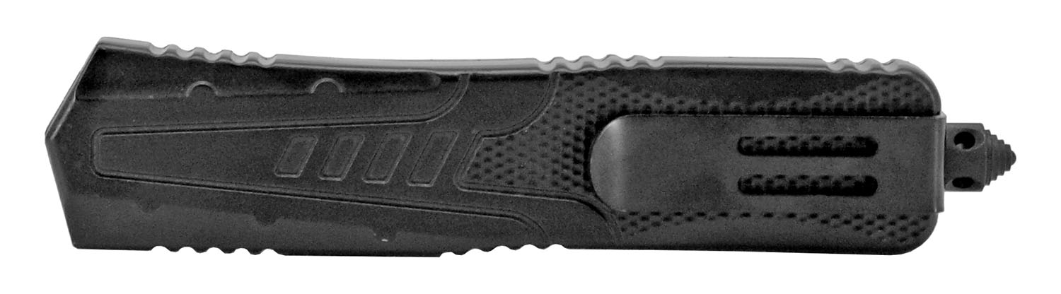 9 Inch Black Beauty OTF Automatic Knife Black Tanto Serrated. Blade Material 440 Stainless Steel Blade double Action Out the Front Handle Construction Stainless Steel Features Belt Clip, Glass Breaker, and Nylon Carrying Case Blade Length 3.5" Handle Length 5.5" Overall Length 9"