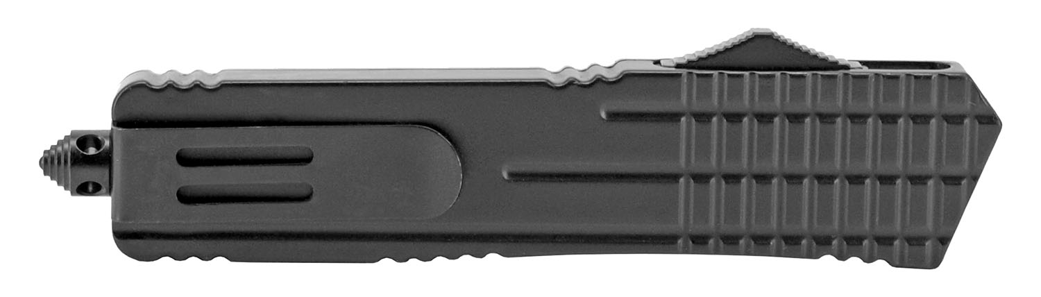 9" Journey Man Black OTF Automatic Knife Black Spear Serrated. Blade Material 440 Stainless Steel Blade Type Serrated Folding Action Out the Front Handle Construction Stainless Steel Features Belt Clip, Glass Breaker, and Nylon Carrying Case Blade Length 3.5" Handle Length 5.5" Overall Length 9"