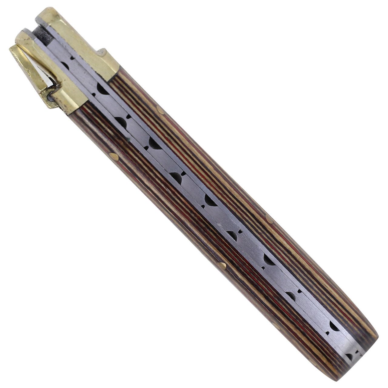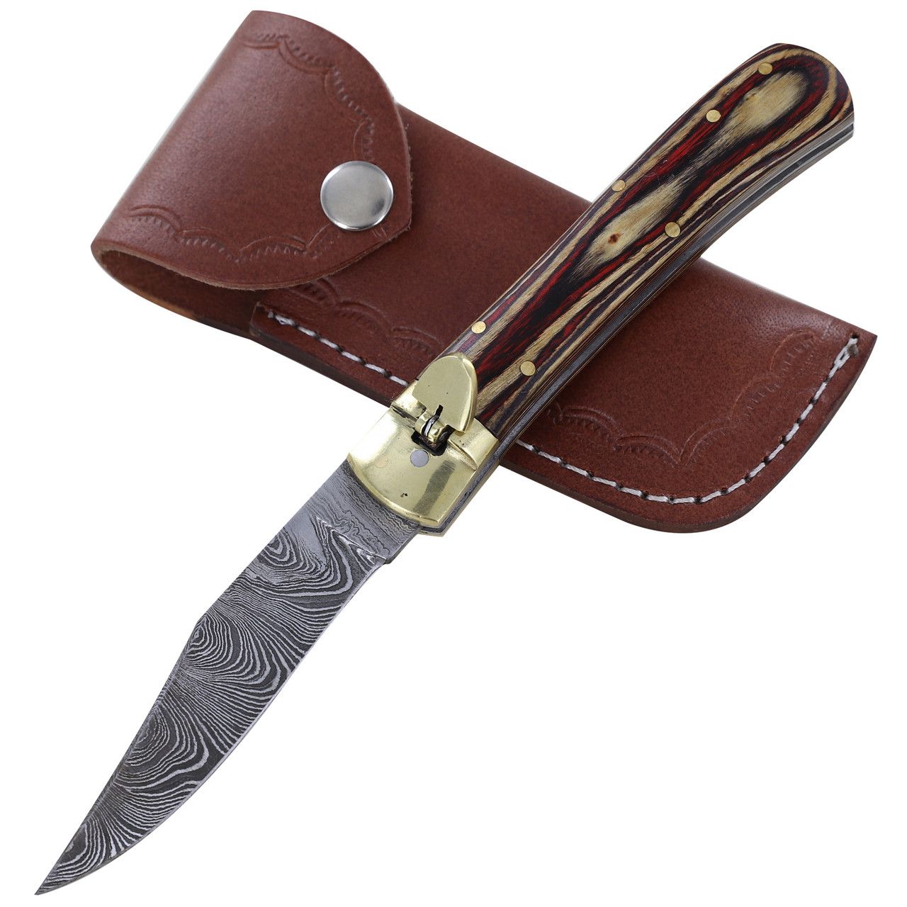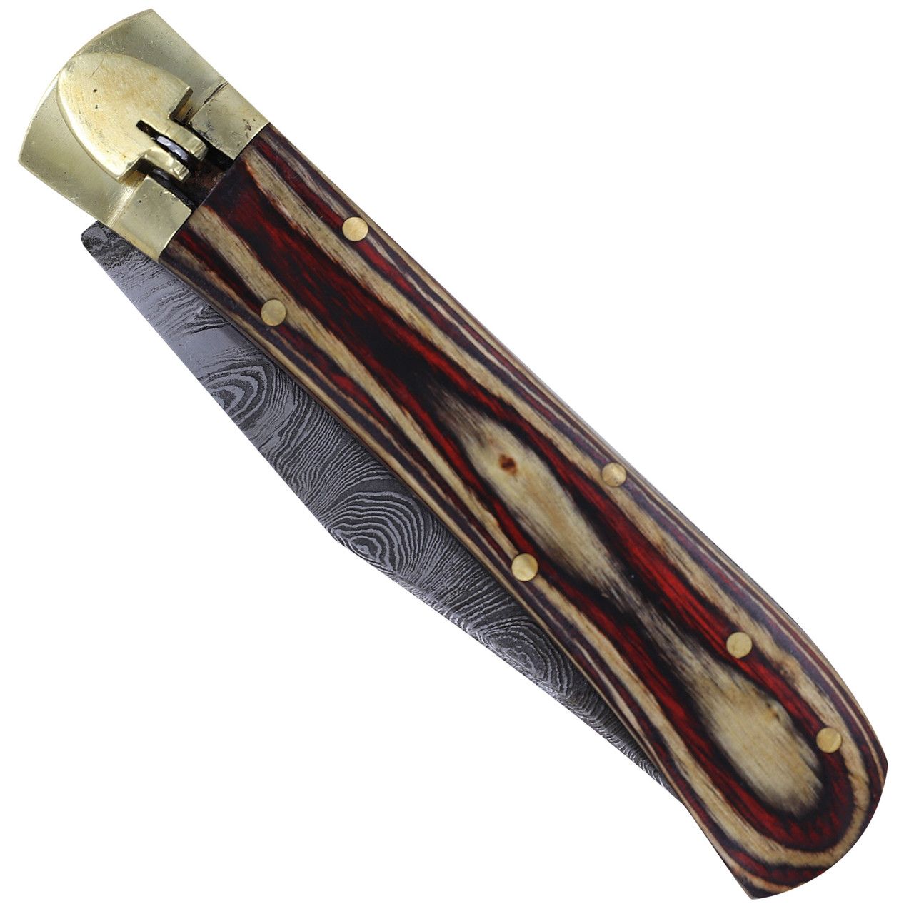 9" Leverlock Damascus Outlaw Automatic Knife File Work. Overall Length: 9 Inches Blade Length: 4 Inches Blade Width: 0.75 Inch Blade Thickness: 3.02 mm Blade Style: Clip Point Blade Construction: Damascus Steel, 15N20, 1095 High Carbon Handle Construction: pakkawood, Solid Brass Handle Length: 5.05 Inches Includes: Genuine Leather Sheath file work down the spine