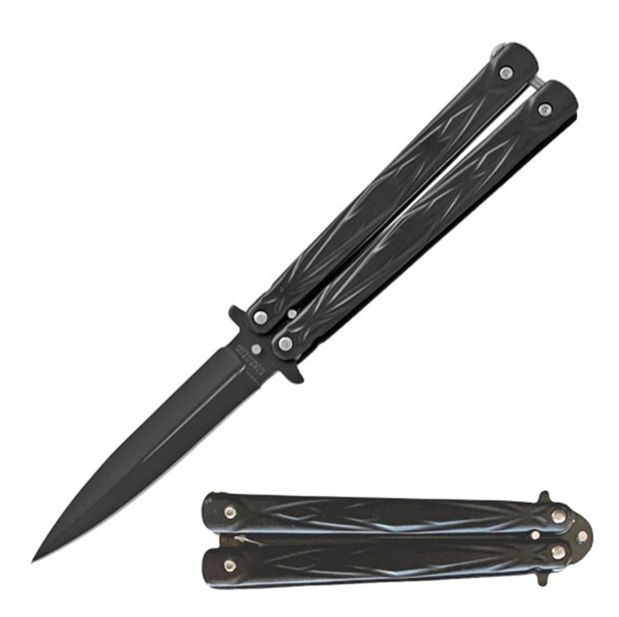 9" Overall Length Butterfly Sudden Fatality Tribal Knife. The handle is double walled with a steel frame. The stainless steel construction makes sure this knife will last and last. The bite handle features a safety latch for locking the blade open and closed. A tribal design was etched on both the front and the back. The dagger point blade has the same finish and material as the handle. This knife will help you single handedly help you get the job done. Cut straps, ropes, or boxes when you are on the job and when you aren't, perform impressive tricks with ease. Specifications Overall Length: 9 Inches Blade Length: 3.75 Inches Handle Length: 5.25 Inches Blade: Stainless Steel Handle Color: Black Handle Material: Stainless Steel Blade Color: Black Features Double Walled Construction Dagger Point Safety Latch