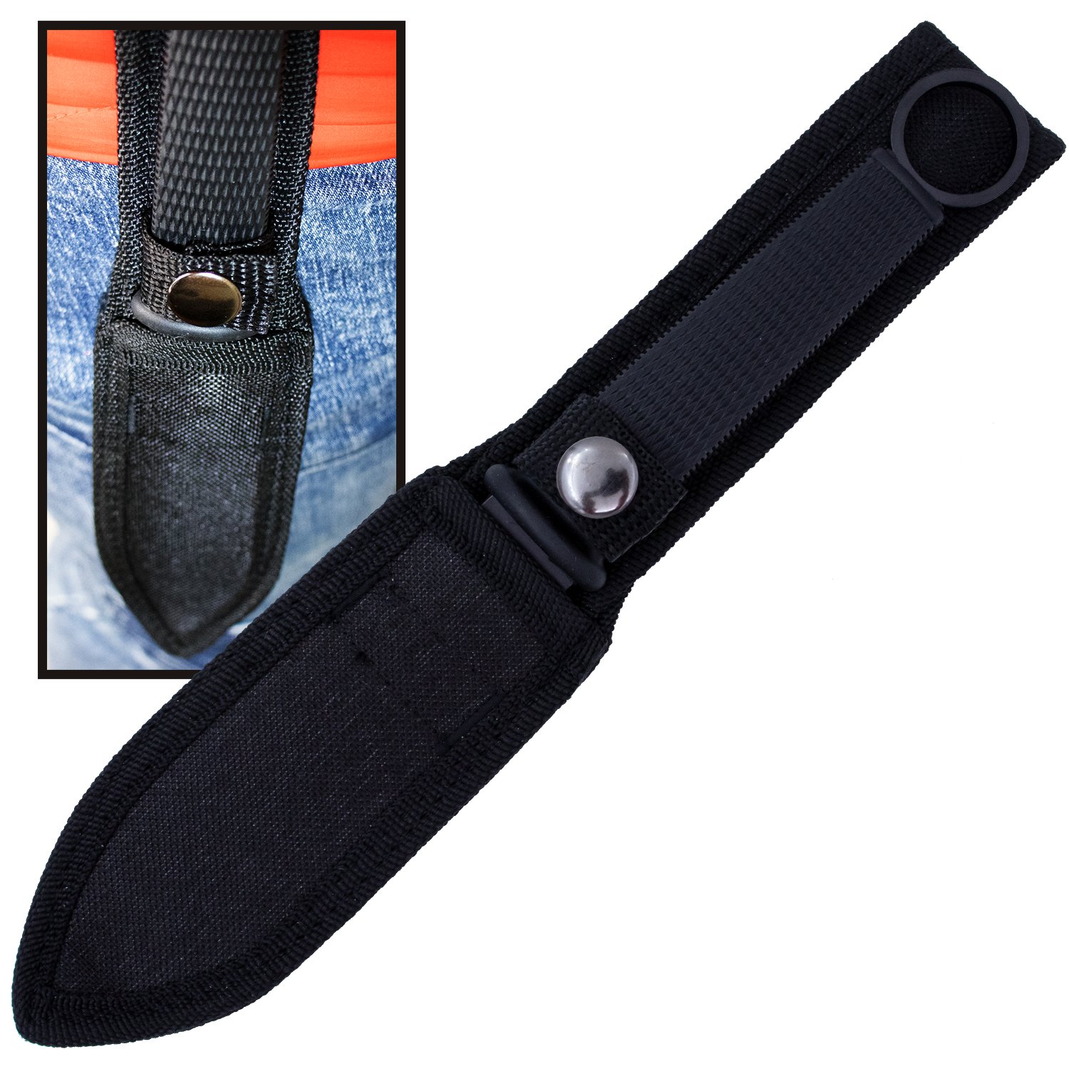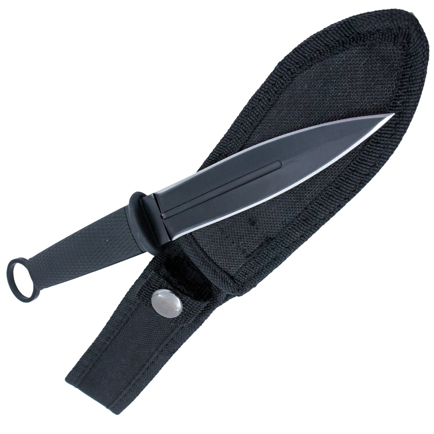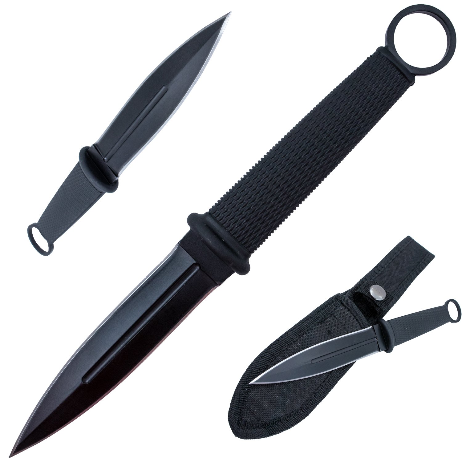 9" Shadow Ops Popular Black Tactical Knife Dagger Finger Ring. The Shadow Ops Long Handle Tactical Knife is perfect for Throwing and CQC. The knife is over 9 inches long with a 4.5 inch razor sharp dual sided blade blade 3mm Thick. Perfectly balanced for easy of use in throwing and handling. The handle is an ergonomic rubber handle allowing for superior grip and control. The knife comes with a canvas sheath with belt loop for easy and convenient storage.