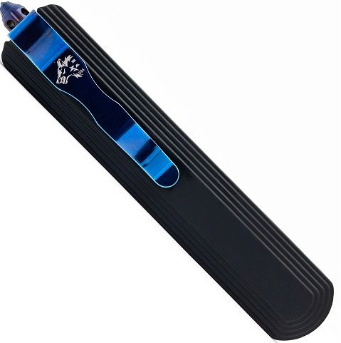 9.25" Best Black D/A OTF Automatic Knife Blue Damascus Dagger. blade is featured and made from 440 stainless steel. The handle is made from zinc alloy with a molded four line design around the edge. A punch for emergencies is provided as well as a steel pocket clip.Overall Length: Overall Length: 9.25 inch, Blade Length: 3.75 inch.