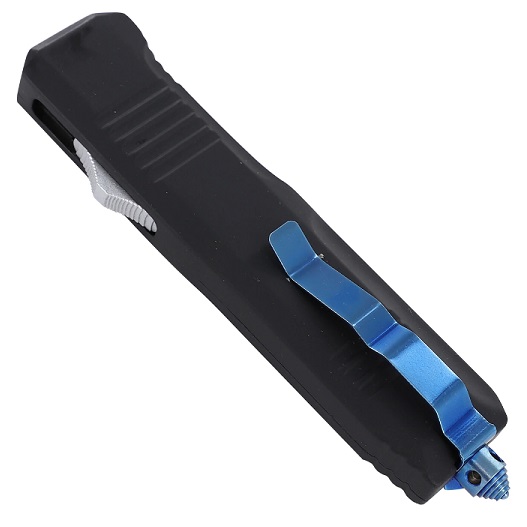 9.5" Damascus Ranger D/A OTF Black Automatic Knife Drop Point. This powerful automatic dual action out the front knife is sure to tickle your fancy. The blade is made from 1095/15N20 Steels to create a gorgeous wave-pattern Damascus. When not in use, the blade is encased in the matte black zinc alloy handle. Use the silver switch on the side of the handle to deploy and retract the blade with little effort. The six sturdy hex screws holding the handle together, as well as the trusty pocket clip and glass breaker on the handle are anodized for a striking blue finish. A black nylon sheath is included with a quick release closure. Overall Length: 9.5 inches, Blade Length: 3.75