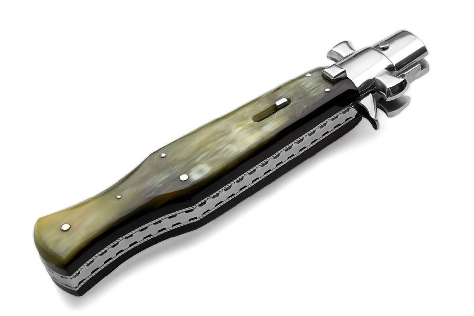 A.G.A Campolin Black Widow Brazilian Cow Horn File Work Italian Stiletto Automatic Knife. This is the fantastic " Black Widow " from the great knifemakers A.G.A Campolin in Maniago, Italy. This handmade automatic stiletto with a maltese crossguard has a square button/safety and comes with lever release mechanism. All components are made from nickel silver and the blade, spring and liners are filed work as used in the old tradition of switchblade production. The round bayonet blade is made of 440C stainless steel and has a mirror polish finish. The handle on this switchblade is a wasp body of brazilian cow horn. The quality and craftsmenship is excellent on this knife. It comes with a A.G.A Campolin certificate. Note: as it is a natural material, color, texture and pattern will vary from knife to knife. Overall Length: 28cm - 11" Blade Length: 12.5cm - 5" Blade thickness: 5mm - 0.2" Weight: 280gr - 9.9oz Blade Material: 440C Stainless Steel Handle Material: Brazilian Cow Horn Made in: Italy