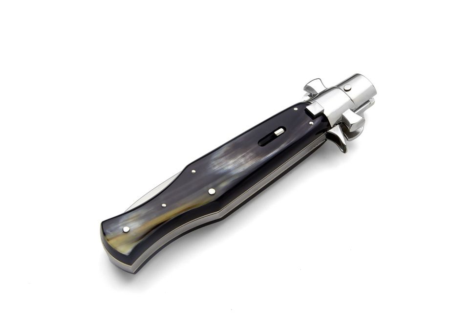 A.G.A Campolin Black Widow Brazilian Cow Horn Full Handle Italian Stiletto Automatic Knife. This is the fantastic " Black Widow " from the great knifemakers A.G.A Campolin in Maniago, Italy. This handmade automatic stiletto with a maltese crossguard has a square button/safety and comes with lever release mechanism. All components are made from nickel silver and it has a 5mm spring and 1.2mm liners. The round bayonet blade is made of 440C stainless steel and has a mirror polish finish. The handle on this switchblade is a wasp body of brazilian cow horn(note: colour, as natural materia, can be light or dark). The quality and craftsmenship is excellent on this knife. It comes with a A.G.A Campolin certificate. Overall Length: 28cm - 11" Blade Length: 12.5cm - 5" Blade thickness: 5mm - 0.2" Weight: 280gr - 9.9oz Blade Material: 440C Stainless Steel Handle Material: Brazilian Cow Horn Made in: Italy