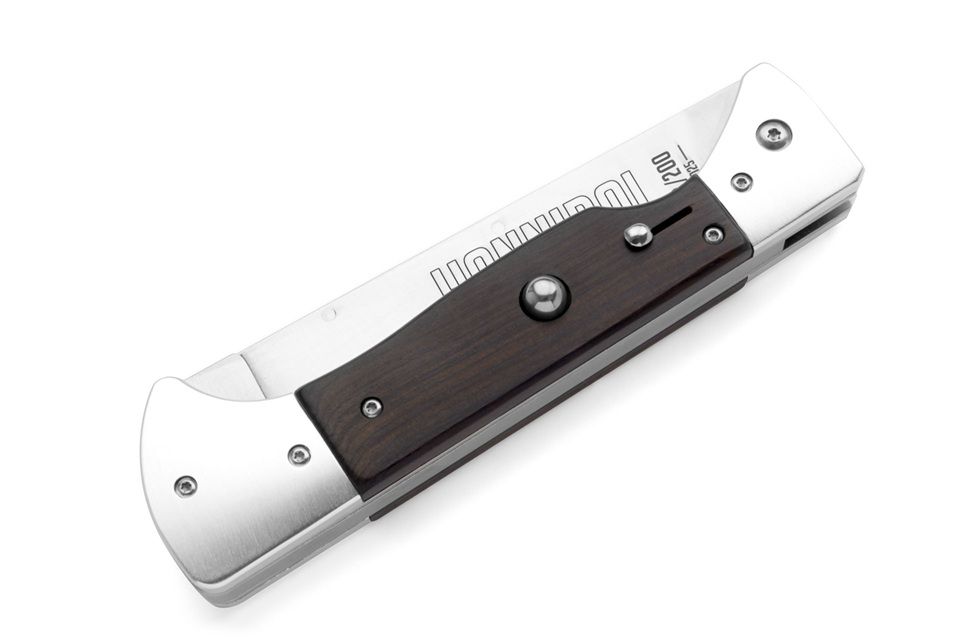 Hannibal A.G.A. Campolin: the first automatic BBQ knife! Born for lovers of automatic knives and stilettos, Hannibal is a unique collector’s item — and also perfect for those who want to impress at a barbecue. Inspired by the classic BBQ knife — with a long blade at the base to keep hands away from the heat — Hannibal redefines the concept with a push-button automatic opening and safety lock, plus a secure liner lock closing system. It’s the only knife on the market that combines both automatic and gravity-assisted opening. The blade, about two-thirds the length of the knife and finely sharpened, offers an unmatched blend of practicality and visual impact. The kick spring is a two-piece design, like the vintage switchblades. Its thick and sturdy spring measures an impressive thickness of 6mm. Be careful when closing the knife. It has a double liner lock: the first without the lock, then with the second 'fold' of the blade, the two parts of the blade lock into the handle. Watch the video carefully. The 2025 first edition is limited to just 600 individually numbered pieces, divided among three exclusive models: Snake Wood, Ebony Wood, and Imitation Ivory. Each version is numbered from 001/200 to 200/200. Every Hannibal comes with a certificate of authenticity and a box made of fine wood. An absolute must-have for every collector — or for anyone looking to turn their BBQ into a true spectacle! Overall lenght: 34.1cm – 13.4" Blade Lenght: 20 cm – 7.87" / sharp 9cm - 3.5" Blade Thickness: 0.3 cm – 0.11" Blade Material: Stainless steel Handle Material: Imitation Ivory Weight: 315 gr- 11.11 oz