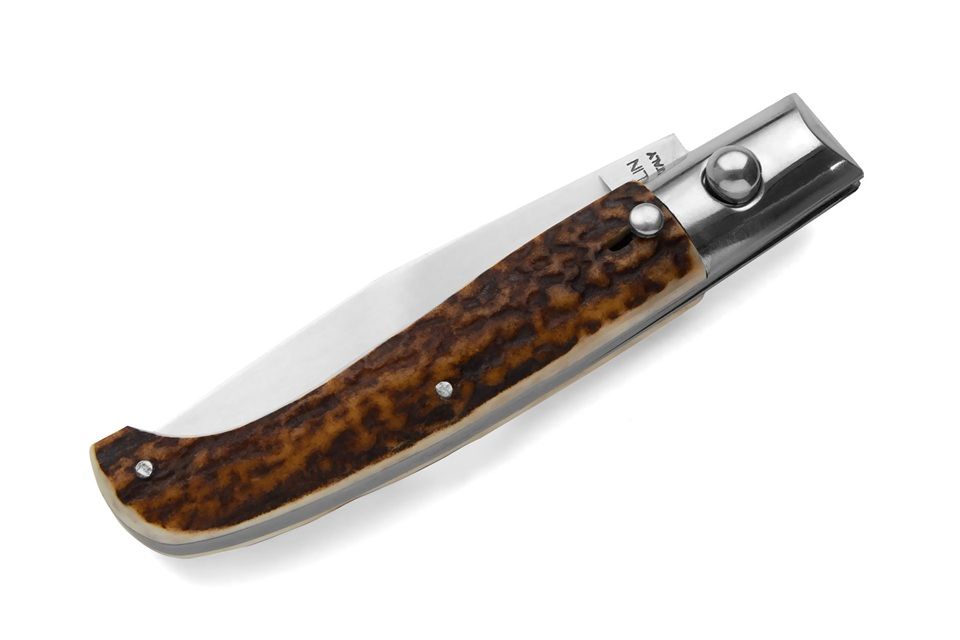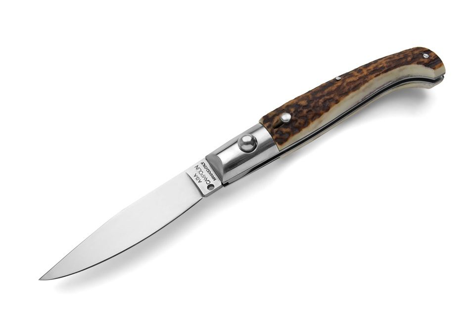 A.G.A. Campolin Pattada Stag Horn Italian Automatic Knife. We are pleased to present the first production of a classic Italian automatic knife: the "Pattada". Originally produced in the 1960s, it is now reintroduced with some embellishments by A.G.A. Campolin from Maniago. The mechanism is activated and unlocked with the button. All parts (bolster, button, safety, and rivets) are made of nickel silver. The handle, crafted from natural Brazilian Cow Horn and finished by hand, adds a touch of class to this knife. The blade is made of N690Co steel with the logo stamped using a punch. It comes with a leather sheath and box. A genuine italian knife. As natural handles are used, colors and shades may vary compared to the photo. Overall length: 21cm - 8.27" Blade length: 8 cm - 3.15" Weight: 109gr - 3.88oz Blade Material: Steel Handle Material: Stag Horn Made in: Italy