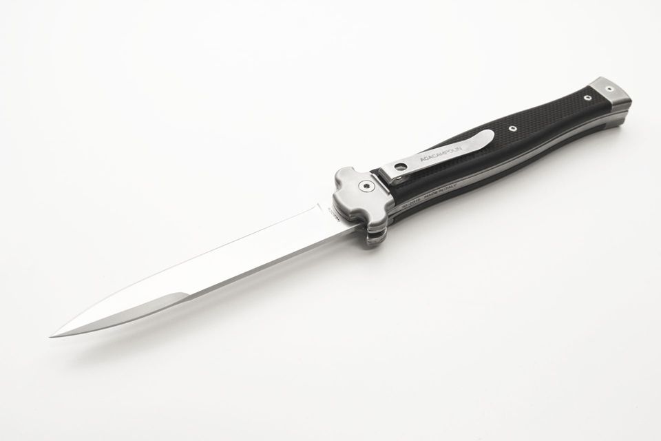 A.G.A. Campolin Zero Plus G10 Black Leverlock Automatic Knife. ZERO+ is a modern stiletto with leverlock mechanism and is the longest leverlock available!! It has a N690Co stainless steel bayonet blade with satin finish and a solid AISI 430 steel glass blasted bolster. The double spring gives faster action and guarantees longer durability. The inverted lever gives a quick opening action. The black G10 handle has a 3d texture for a better grip. The stainless steel pocket clip can be easily removed and replaced with a steel shield. ZERO+ is covered by 1 year warranty from the original end user's purchasing date. Overall length: 26cm - 10.25" Blade length: 12cm - 4.7" Blade thickness: 3.5mm - 0.14" Weight: 215g - 7.6oz Blade material: N690Co Stainless Steel Handle material: G10 Made in: Italy