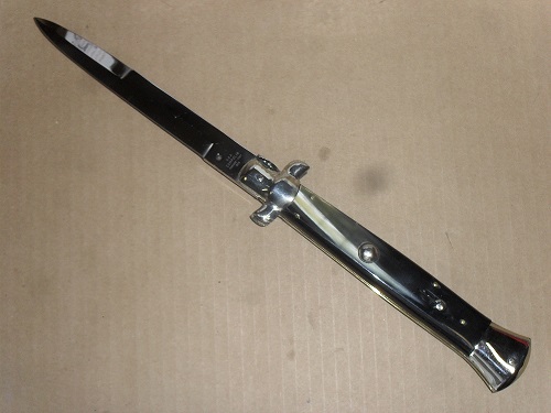 AGA Campolin 15 Inch Italian Stiletto Automatic Knife Brazilian Horn Bayo. Overall Length: 38cm - 15" Blade Length: 18cm - 7" Blade thickness: 5.0mm - 0.2" Weight: 390 gr. Blade Material: Stainless steel AISI 420 Handle Material: Brazilian cow horn Frame Material: Brass Made in: Italy