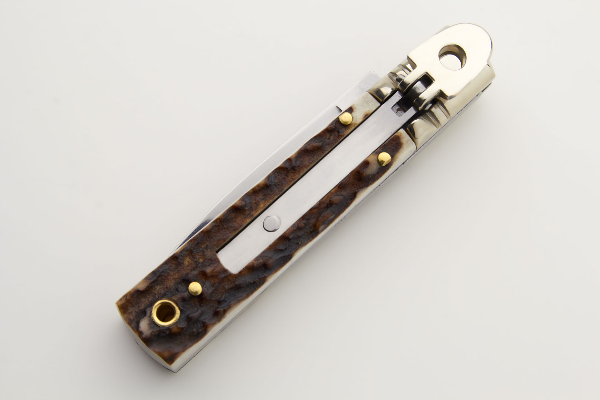 AGA Campolin 6" Stag Horn Lever Lock Automatic Knife. This is the classic slim version. The small size makes it fit in your pocket perfectly. Stainless steel bolsters - Overall Length: 15cm - 6" Blade Length: 6,5cm - 2,5" Blade thickness: 2,7mm - 0.11" Weight: 75 gr Blade Material: Stainless steel Handle Frame Material: Brass Made in: Italy