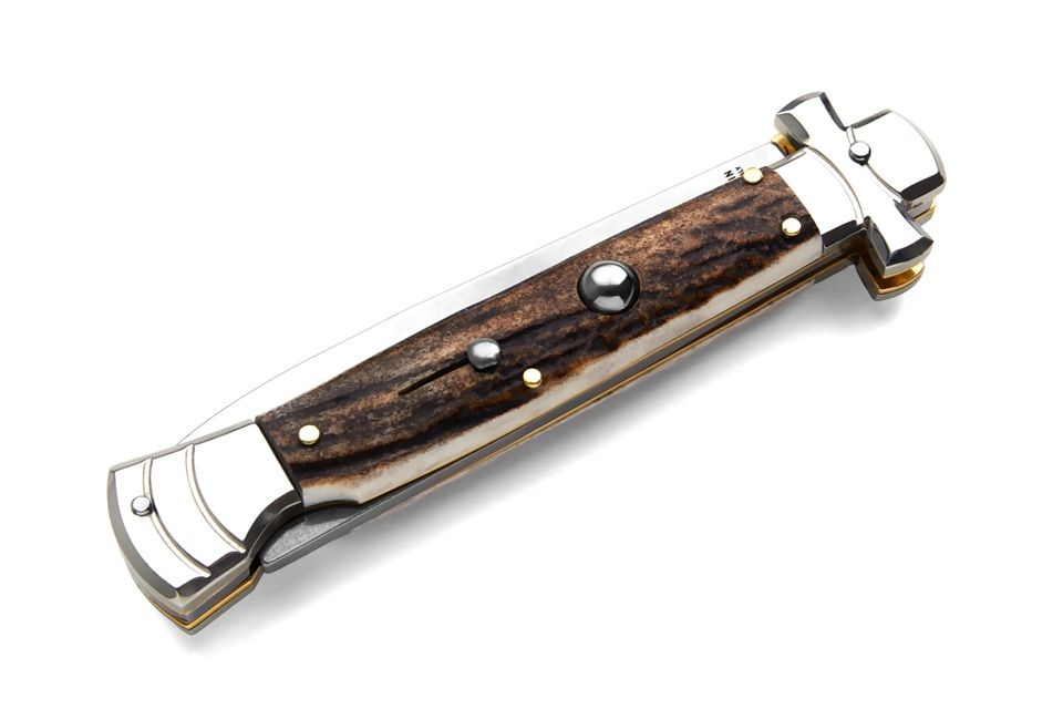 AGA Campolin 9" Maltese Cross Stag Horn Stiletto Automatic Knife Bayo. Overall Length: 23cm - 9" Blade Length: 10cm - 4" Blade thickness: 3,5mm - 0.14" Weight: 175 gr. Blade Material: AISI 420 Stainless steel Handle Material: Stag Frame Material: Brass Made in: Italy