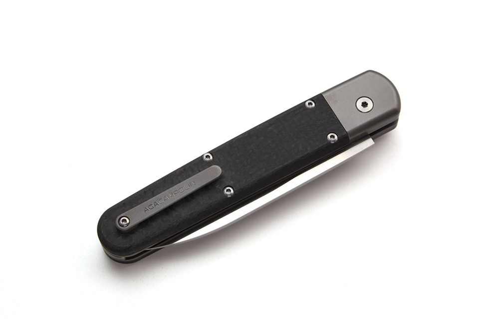 AGA Campolin Automatic Leverlock Baron Elite Limited Edition Titanium Knife Carbon Fiber Satin. We are excited to present you the latest switchblade from the italian knifemaker company A.G.A Campolin the Baron Elite. This automatic knife is the modern evolution of the Baron build with the same leverlock mechanism like the successful "Zero". This Baron Elite is a Limited Edition of 100 pieces made in 02/2023. It features a satin finished Böhler M390 stainless steel drop point blade. The handle on this switchblade is made of carbon fiber 3D scales, it has black titanium bolsters and liners, the clip and srews are sandblasted titanium. The springs are very easy to replace and the Baron Elite Limited Edition comes with an extra spring in the carbon paper box and certificate. Overall length: 20cm - 7.9" Blade length: 8.5cm - 3.3" Weight: 190g - 6.7oz Blade material: Böhler M390 Stainless Steel Handle material: Carbon Fiber Made in: Italy
