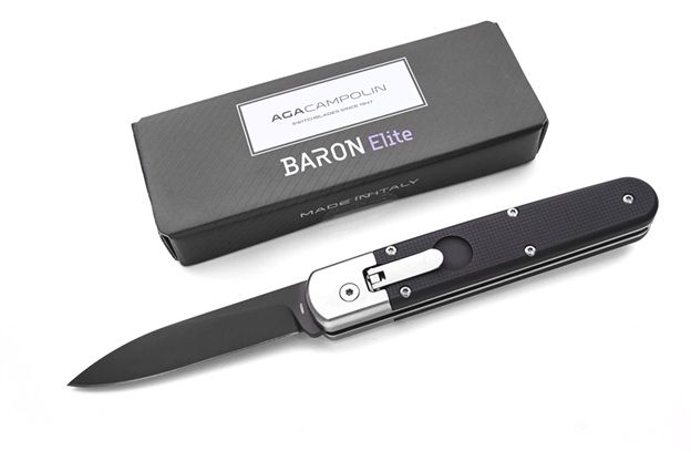 We are excited to present you the latest switchblade from the italian knifemaker company A.G.A Campolin the Baron Elite. This automatic knife is the modern evolution of the Baron build with the same leverlock mechanism like the successful "Zero". It has N690Co stainless steel drop point blade with black PVD coating and solid stonewashed AISI 420 steel liners and bolsters. The double spring gives faster action and guarantees longer durability where the inverted lever ensures quick opening action. The handle is made of black G-10 with a 3d texture for a better grip and comes with a stainless steel pocket clip. The springs are very easy to replace and the Baron Elite comes with an extra spring in the carbon paper box. This new Baron Elite leverlock is an exellent quality EDC. Overall length: 20cm - 7.9" Blade length: 8.5cm - 3.3" Weight: 190g - 6.7oz Blade material: N690Co Stainless Steel Handle material: G-10 Made in: Italy