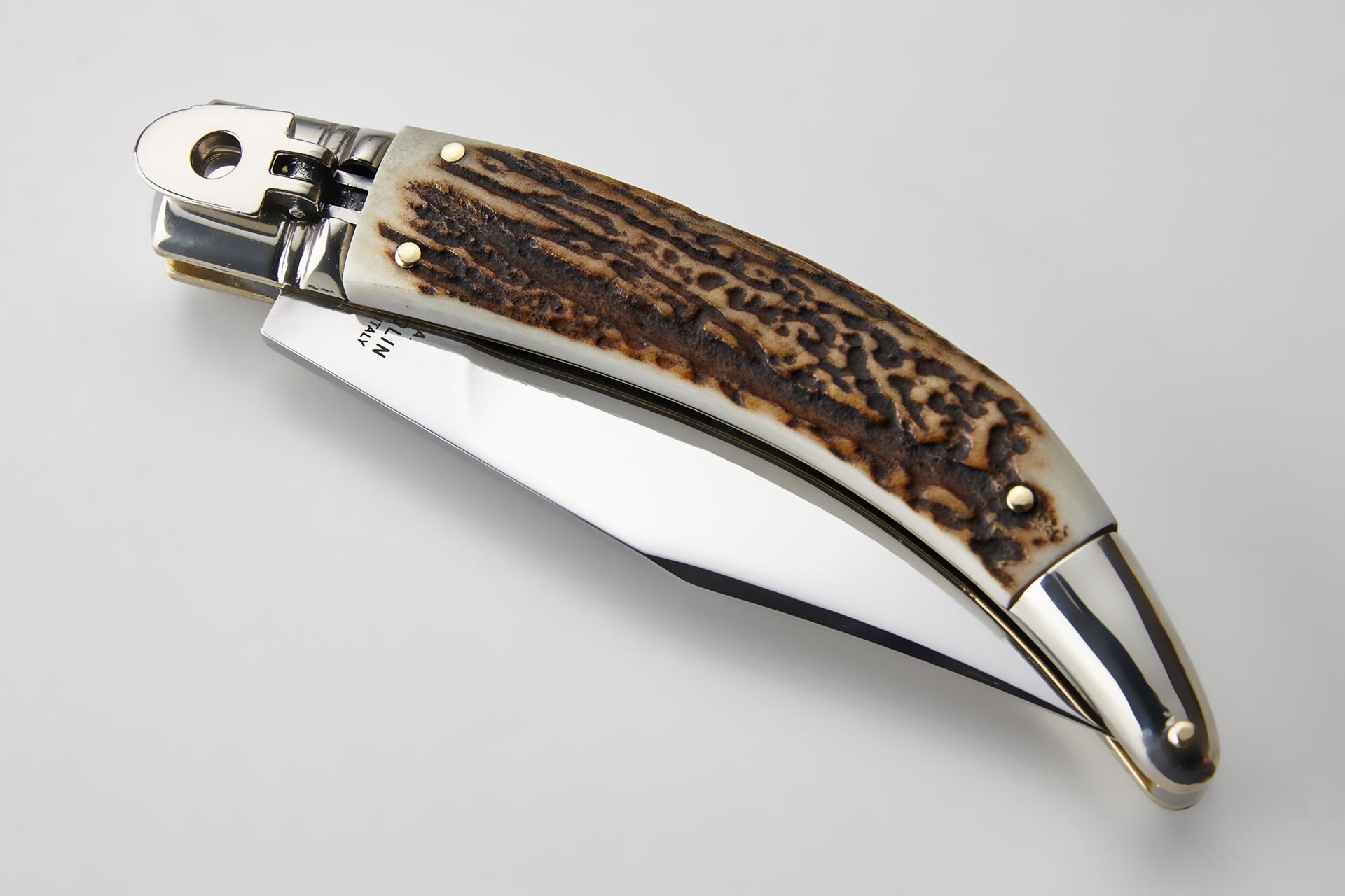 AGA Campolin Diana Stag Horn Italian Leverlock Automatic Knife. Overall Length: 21,5 cm - 8.5" Blade Length: 10cm - 4" Blade thickness: 3,5mm - 0.14" Weight: 140 gr. Blade Material: Stainless steel 440C Handle Material: Genuine european stag Frame Material: Brass Made in: Italy