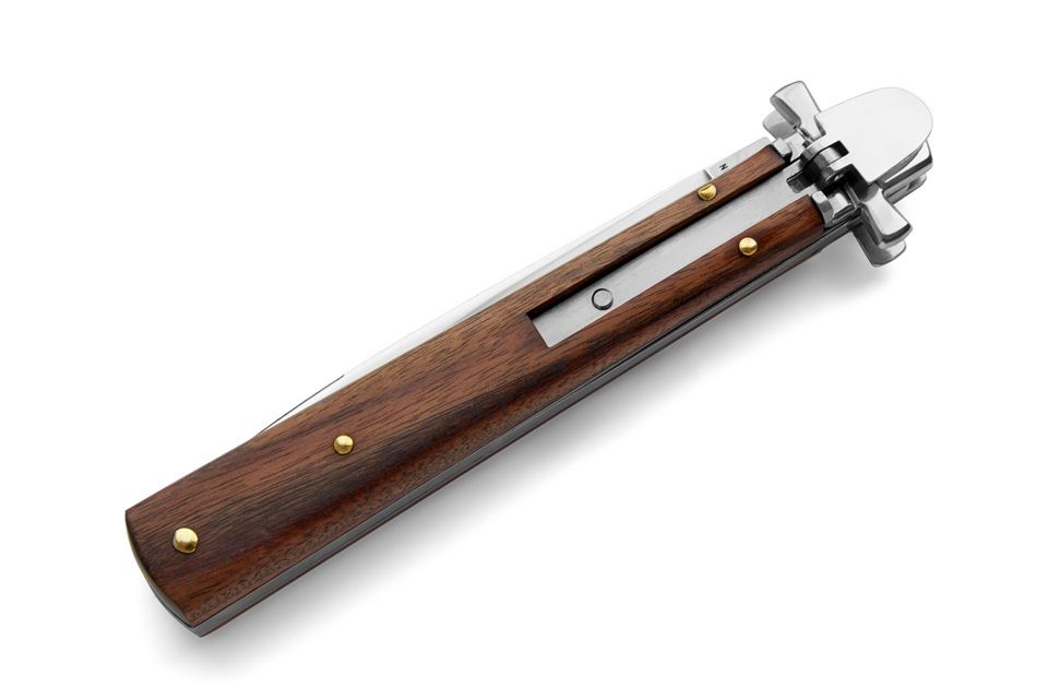 This automatic knife is called "Dominus" which means the "Lord". A brand new switchblade made by AGA Campolin from Maniago, Italy. It has nickel silver bolsters with a maltese cross guard shape and lever to open and release the mechanism. The round bayonet grind and liners are made with 440A steel. The quality of this knife is amazing. It comes with paper box. Note: as it is a natural material, colour, texture and pattern will vary from knife to knife. Overall Length: 23cm - 9" Blade Length: 10cm - 3.9" Blade thickness: 2,7mm - 0.11" Weight: 139gr - 4.9ozBlade Material: Stainless steel 440 A Handle Material: Cocobolo Wood Made in: Italy