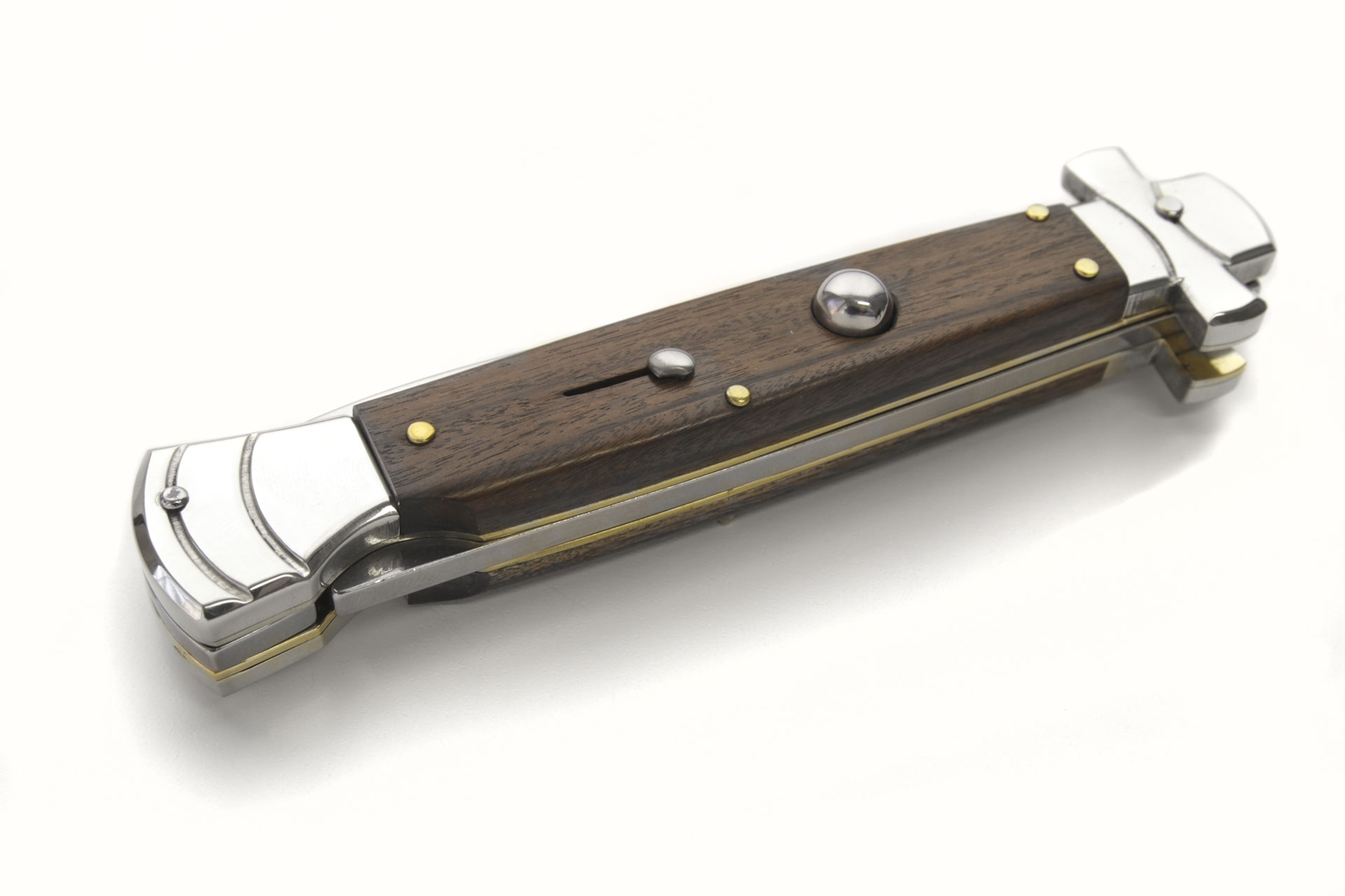 AGA Campolin Maltese Cross 9" Santos Wood Stiletto Automatic Knife Dagger. This A.G.A. Campolin Maltese automatic knife is an amazing quality stiletto. Solid nickel silver bolsters that remind of the maltese cross and the handle comes in different natural scales. Lock back release and very nice shape makes this switchblade a beauty for knife collectors. It comes with a certificate and an A.G.A Campolin leather pouch. Note: as it is a natural material, color, texture and pattern will vary from knife to knife. Overall Length: 23cm - 9" Blade Length: 10cm - 4" Blade Thickness: 3mm - 0.14" Weight: 175gr - 6.2ozBlade Material: 440A Stainless Steel Handle Material: Santos Wood Made in: Italy