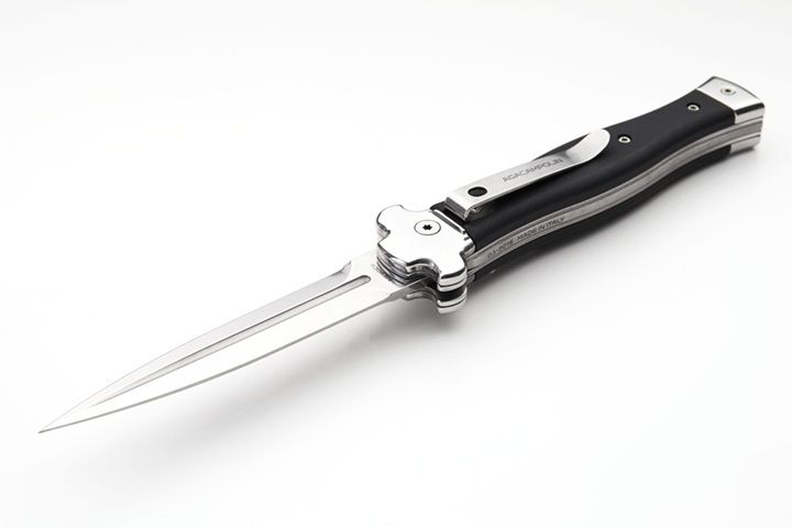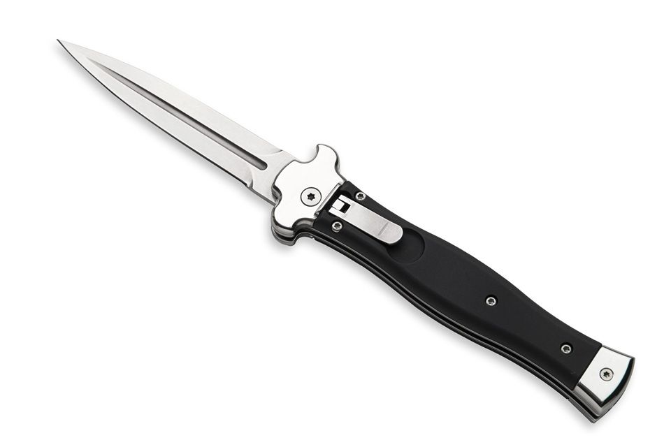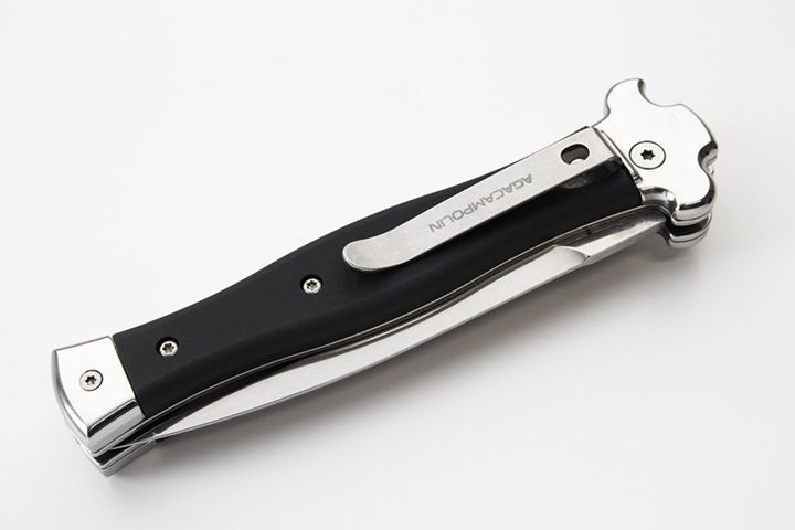 AGA Campolin Zero Black Aluminum Leverlock Automatic Knife Satin Dagger. Overall length: 23 cm - 9" Blade length: 10 cm - 3.94" Blade thickness: 3.5 mm - 0.14" Weight: 170g - 5.99oz Blade material: N690Co stainless steel Handle material: Black aluminium Made in: Italy