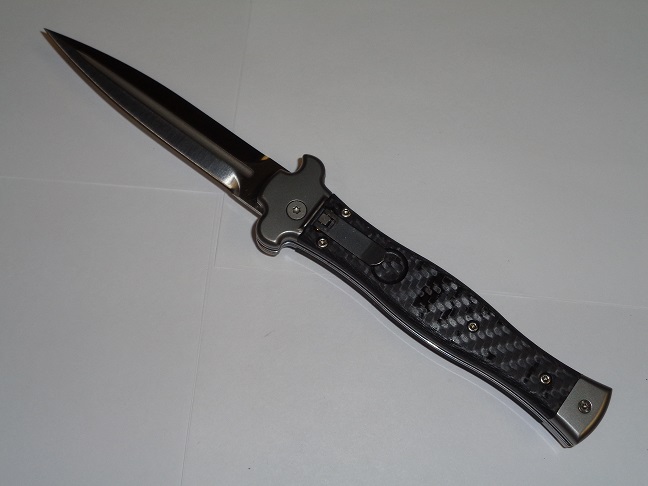 AGA Campolin Zero Black Carbon Fiber Leverlock Automatic Knife Satin Dagger. Overall length: 23 cm - 9" Blade length: 10 cm - 3.94" Blade thickness: 3.5 mm - 0.14" Weight: 170g - 5.99oz Blade material: N690Co stainless steel Handle material: Carbon fiber Made in: Italy