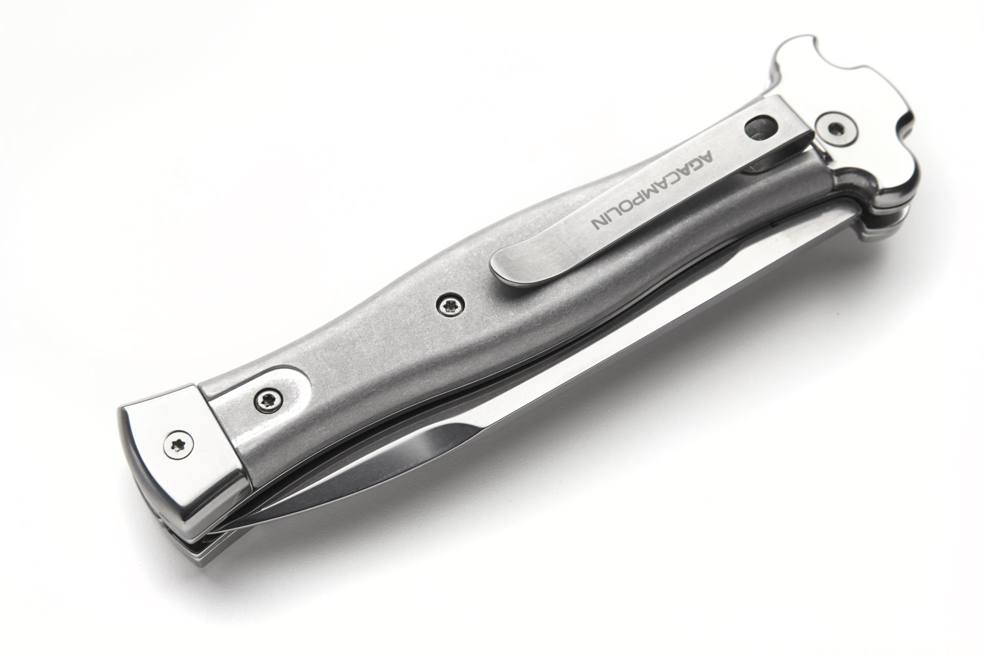 AGA Campolin Zero Leverlock Silver Automatic Knife Mirror Bayo. ZERO is a modern stiletto with leverlock mechanism. It has a stainless steel N690Co blade with mirror polished finish and solid steel AISI 430 polish finished bolster. Double spring gives faster action and guarantee longer durability. Inverted lever for a quick opening action. Anodized aluminium stonewashed handle. Reversible stainless steel clip for the pocket can be easily removed. Overall length: 22 cm - 8,7" Blade length: 10cm - 3.94" Blade thickness: 3.5mm - 0.14" Weight: 170g - 5.99oz Blade material: N690Co Stainless Steel Handle material: Aluminium Made in: Italy