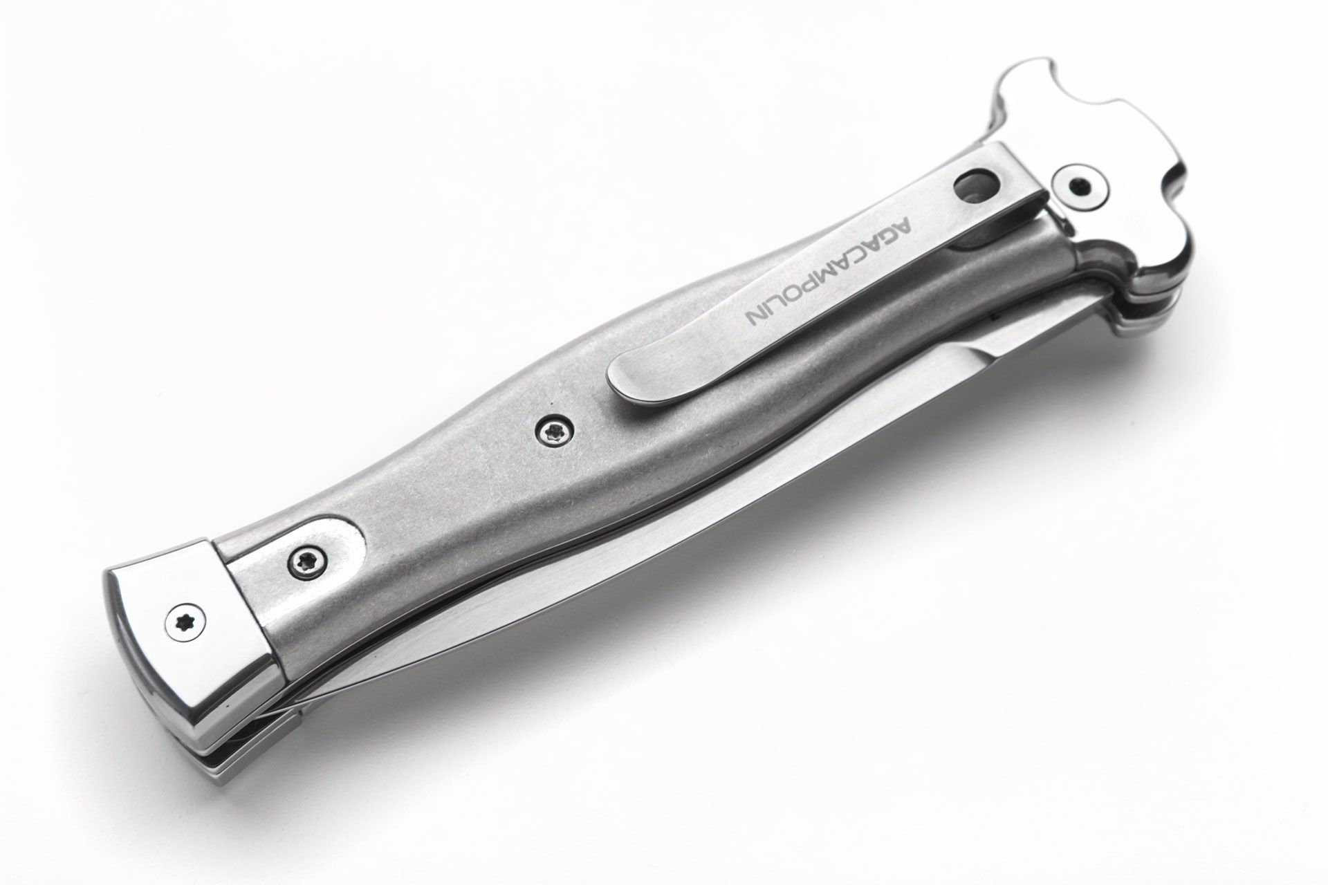 AGA Campolin Zero Leverlock Silver Automatic Knife Mirror Dagger. Overall length: 22 cm - 8,7" Blade length: 10cm - 3.94" Blade thickness: 3.5mm - 0.14" Weight: 170g - 5.99oz Blade material: N690Co Stainless Steel Handle material: Aluminium Made in: Italy