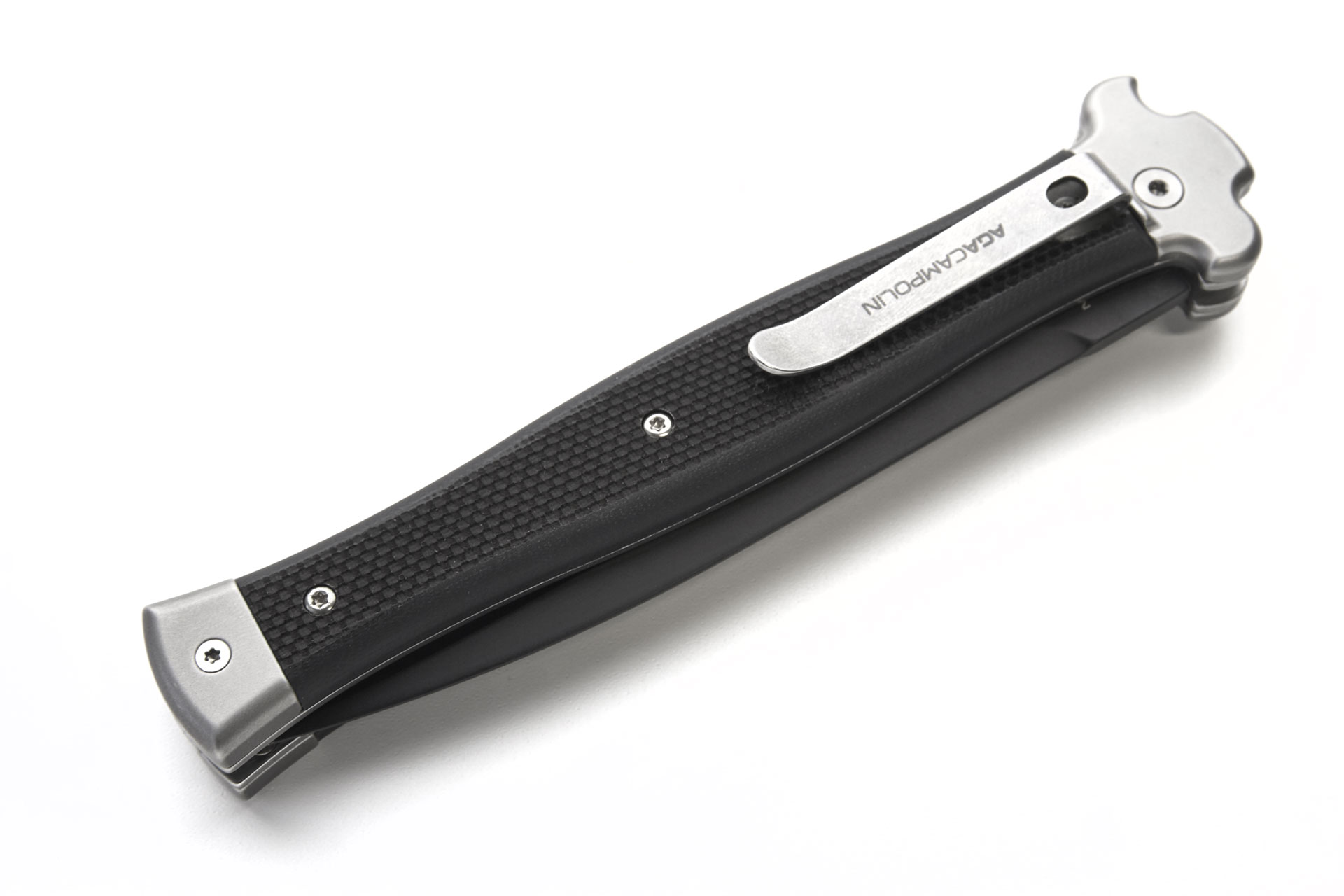 AGA Campolin Zero Plus G-10 Leverlock Automatic Knife Black Dagger. Overall length: 26cm - 10.25" Blade length: 12cm - 4.7" Blade thickness: 3.5mm - 0.14" Weight: 215g - 7.6oz Blade material: M390 Stainless Steel Handle material: G10 Made in: Italy