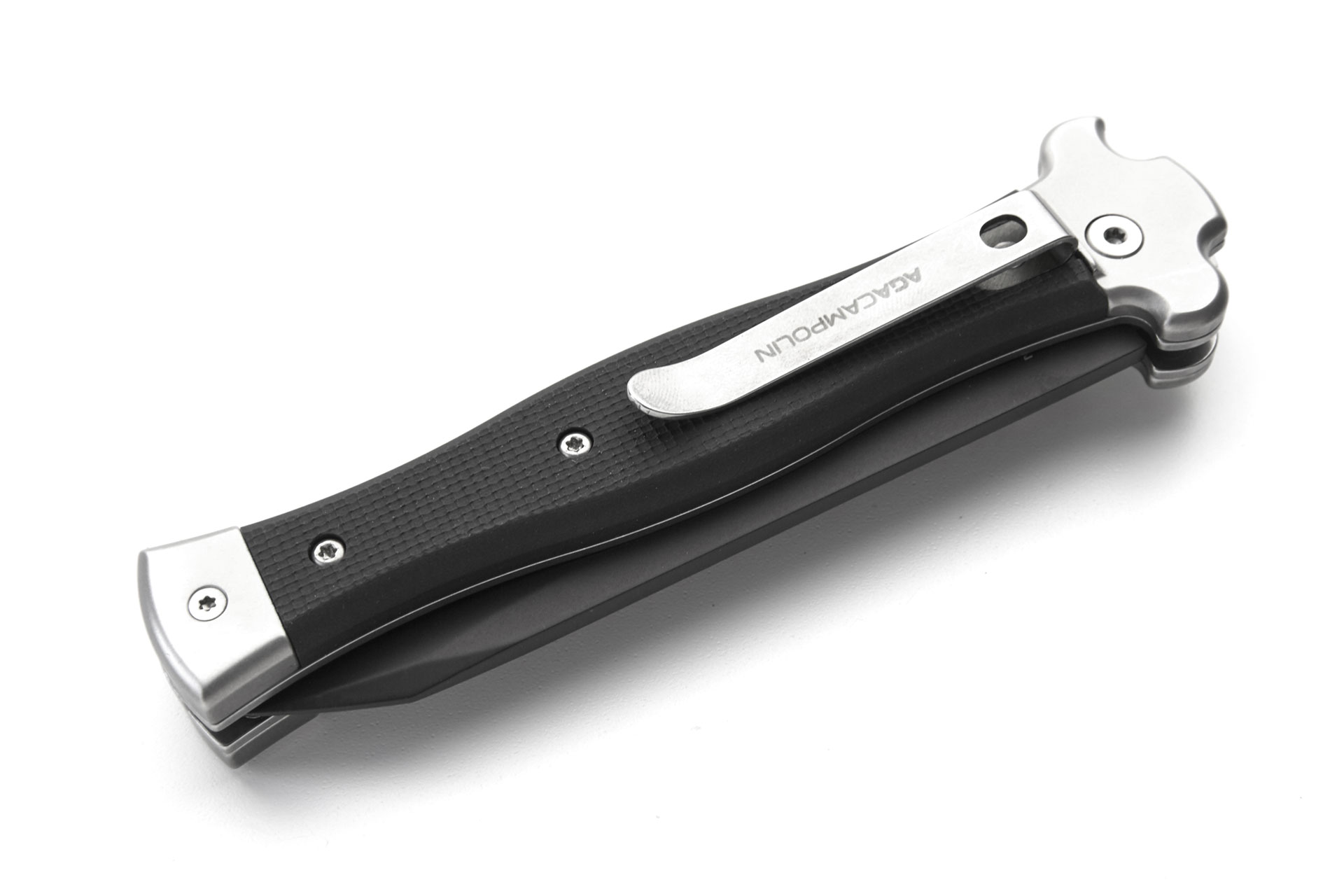AGA Campolin Zero Plus G-10 Leverlock Automatic Knife Black Dagger. ZERO is a modern stiletto with leverlock mechanism. It has a N690Co stainless steel tanto blade with black PVD coated finish and solid steel AISI 430 glass bead blasted bolster. Double spring gives faster action and guarantees longer durability. Inverted lever for a quick opening action. The black G-10 handle with a 3d texture ensures better grip. The stainless steel pocket clip can be easily removed and substitute with a little steel shield. Overall length: 22cm - 8,7" Blade length: 10cm - 4" Blade thickness: 3.5mm - 0.14" Weight: 170g - 6oz Blade material: N690Co Stainless Steel Handle material: G-10 Made in: Italy